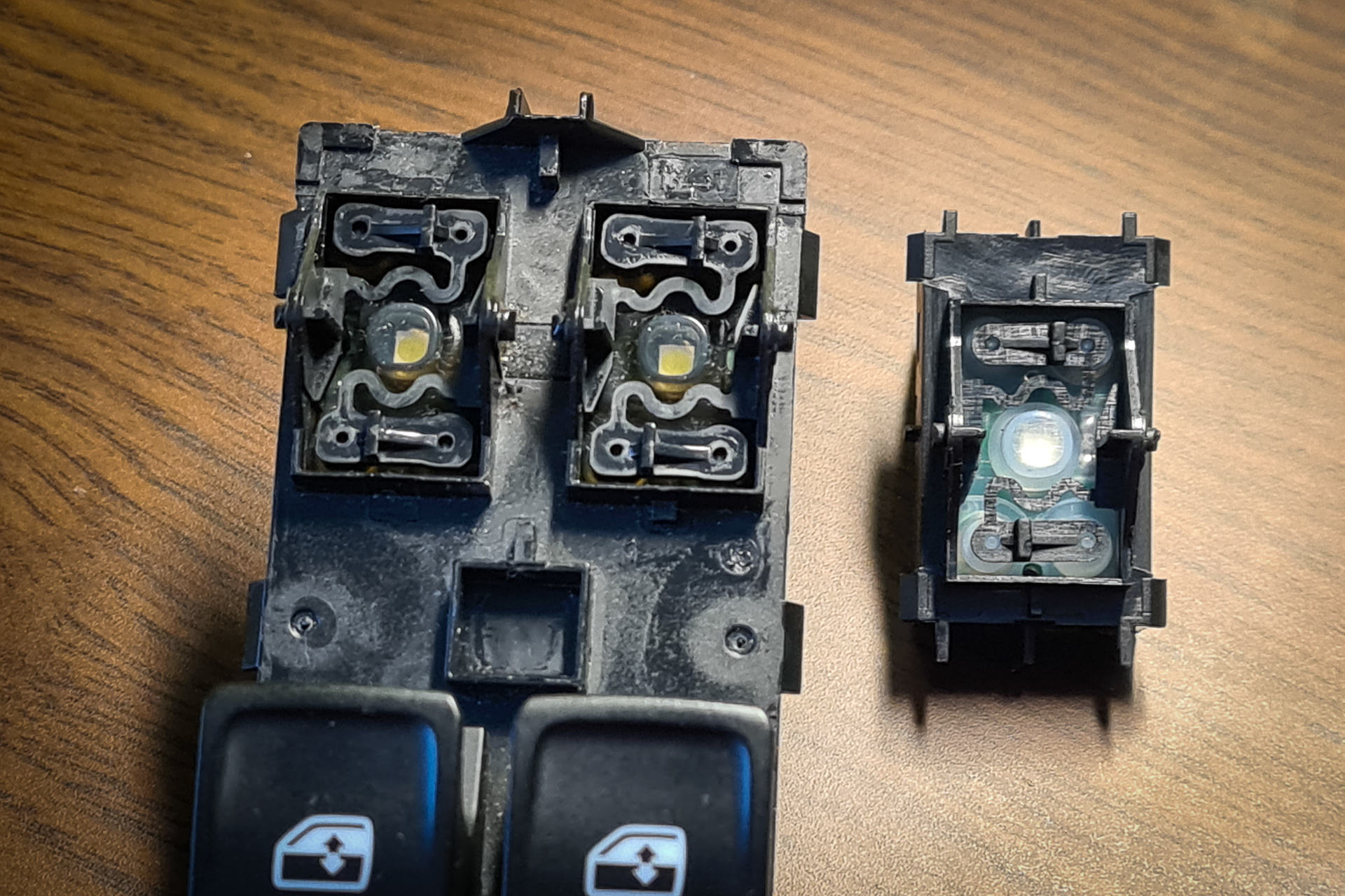 Jedna dobrá správa bola, že konektor dverí pasoval na čínske ovládače. Problém však bol v zelenom podsvietení a že čínsky ovládač pri otváraní okná zatváral a pri zatváraní ich otváral. Našťastie stačilo prehodiť vnútro z originálu do čínskeho ovládača a obe zadné dvere ako aj dvere spolujazdca sú hotové a fungujú bez závad.