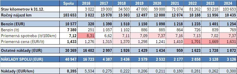 A máme tu koncoročné zhrnutie. Za celý rok 2024 sme najazdili 10.435 km, čo je druhý najnižší ročný nájazd. Rok sme ukončili pri stave tachometra 103.653 km.