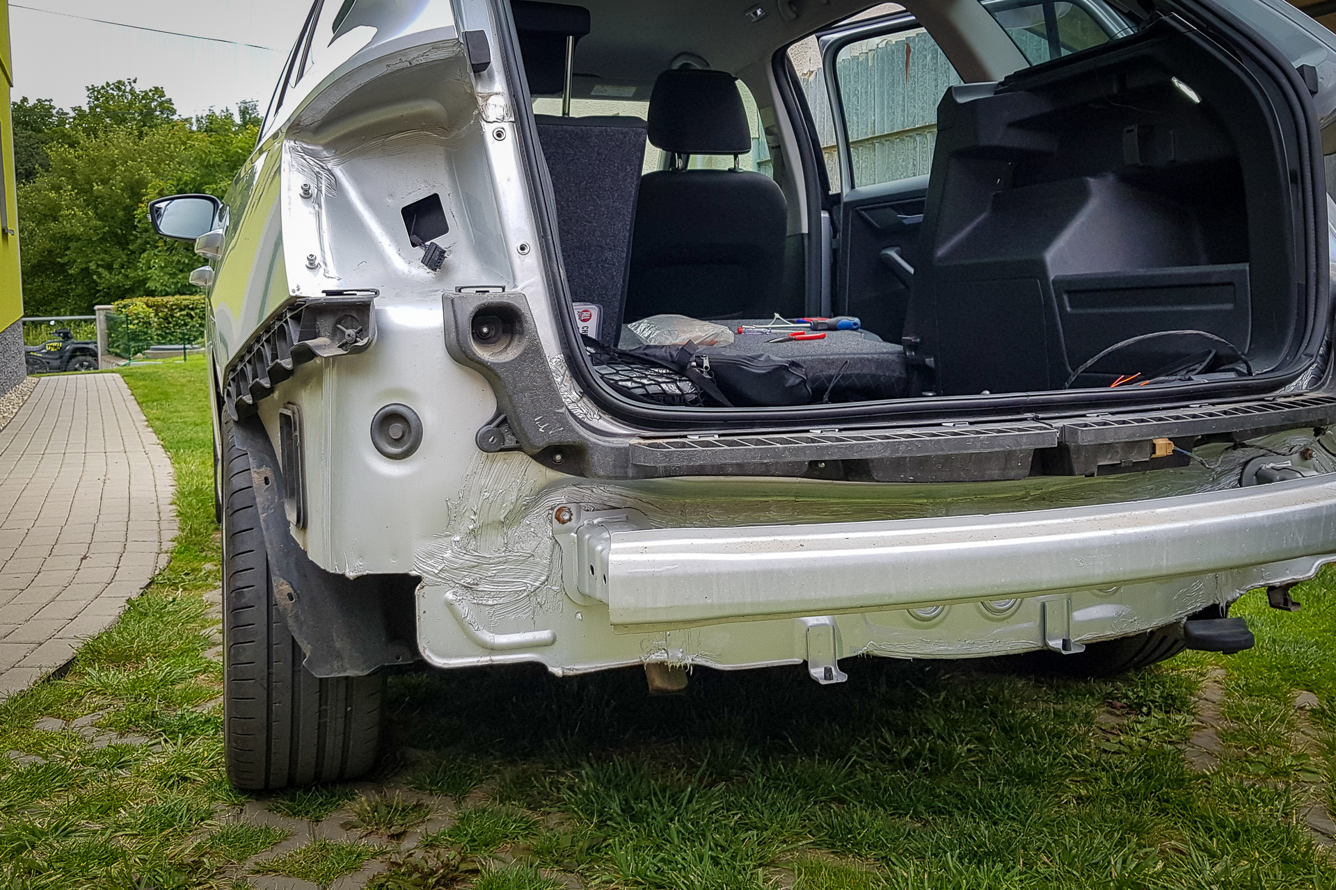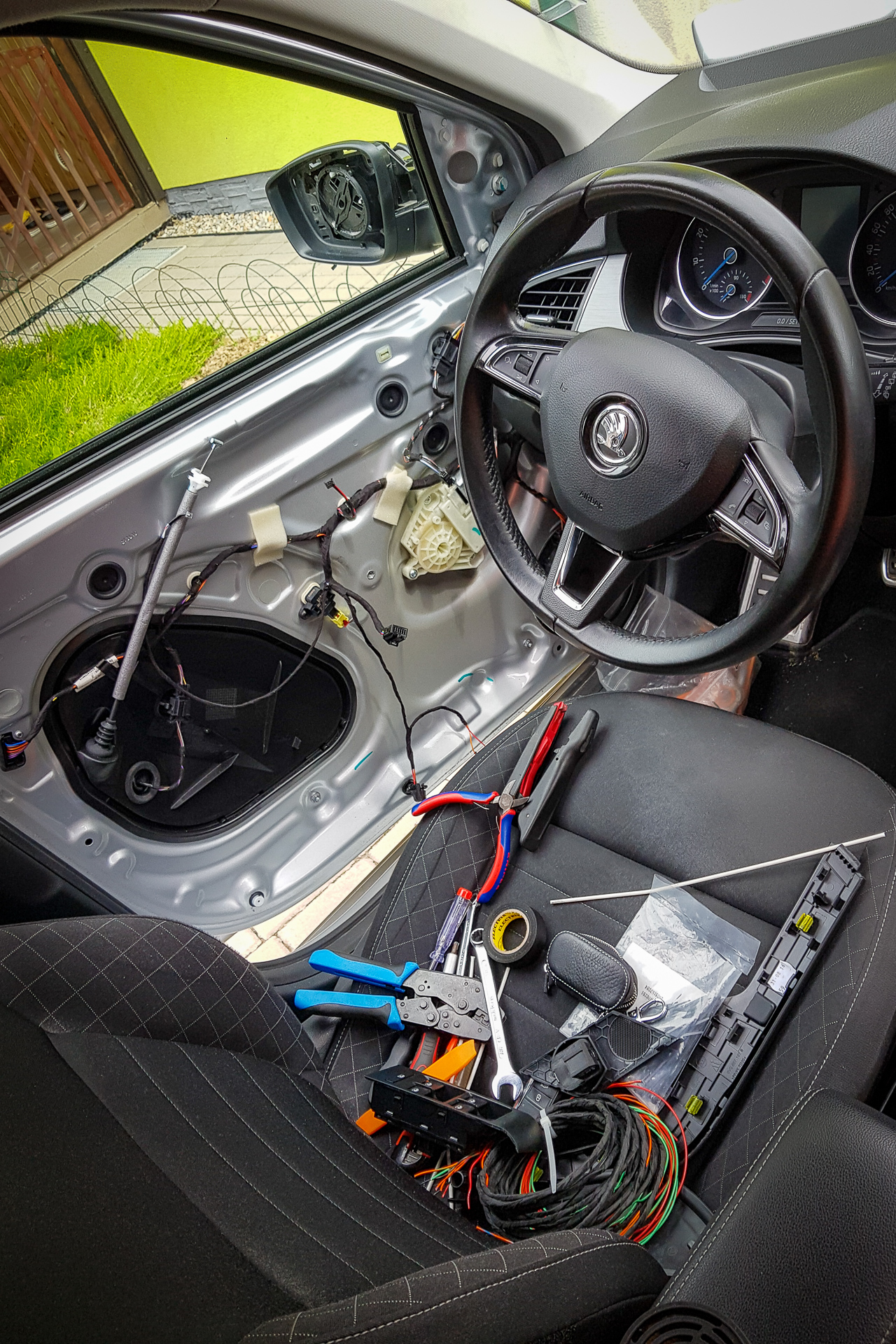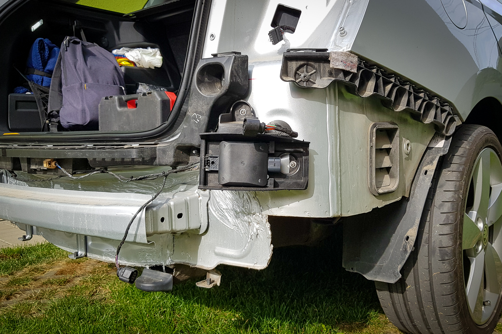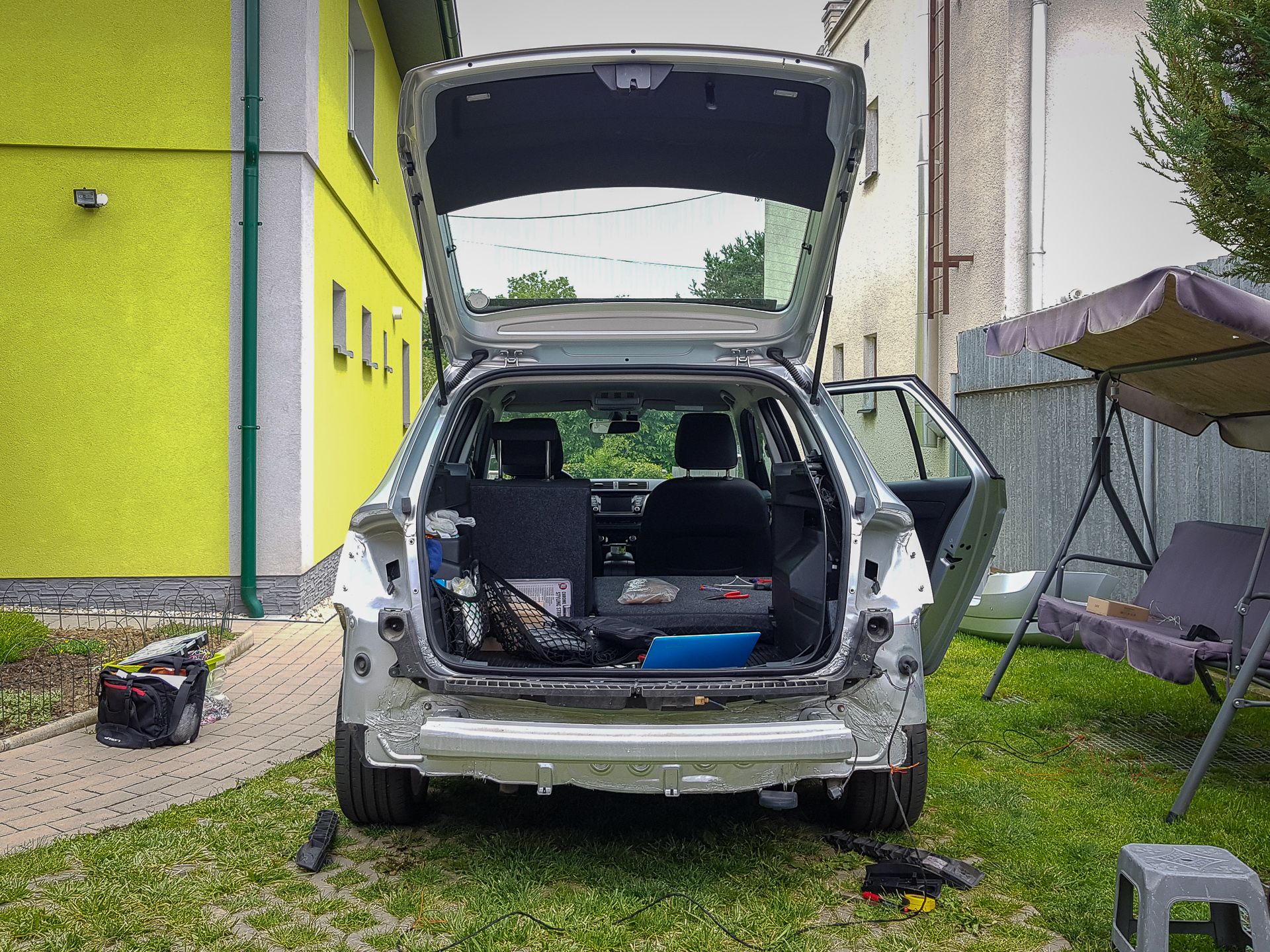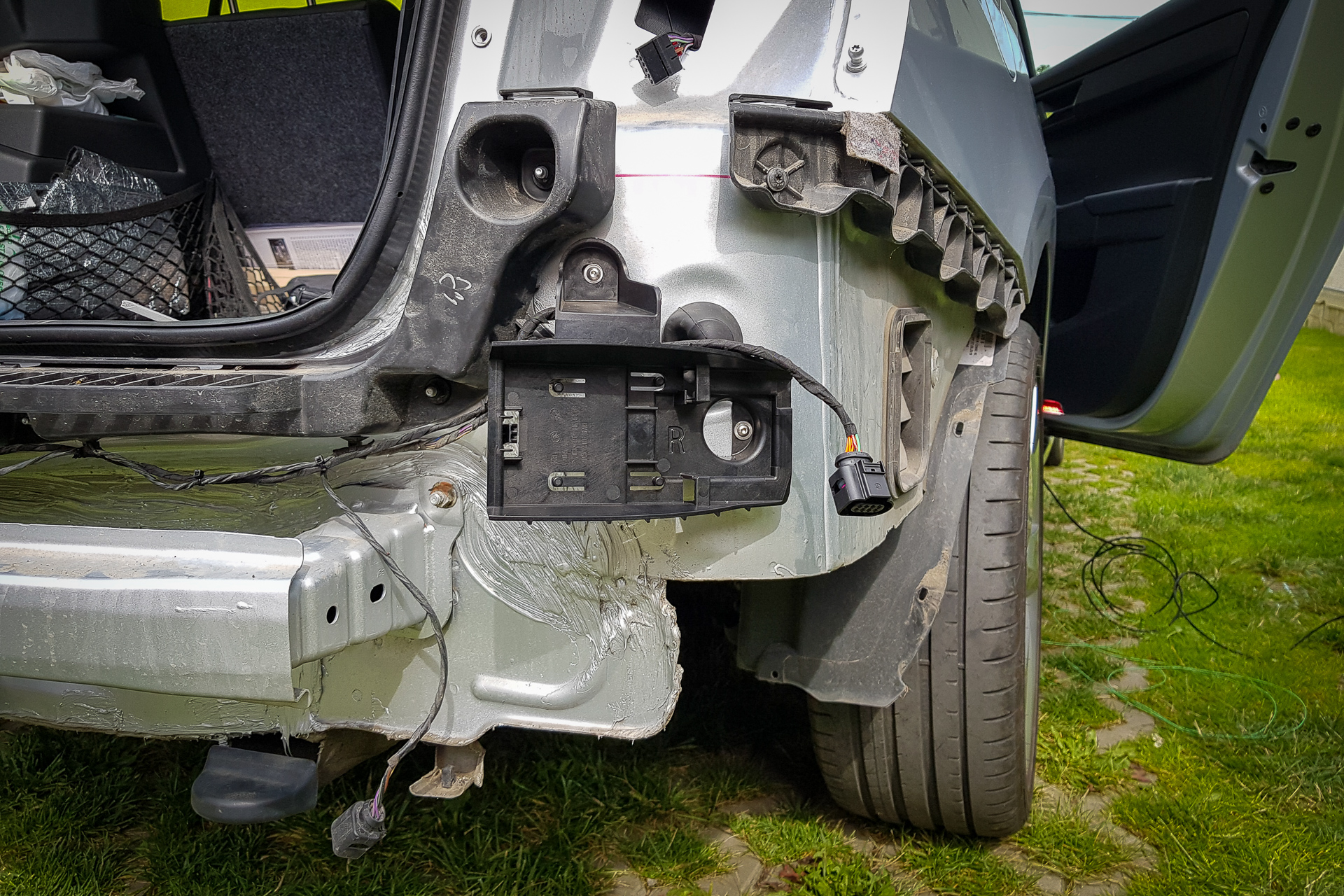 Úvod sa niesol hlavne v znamení káblovačiek. Zadok auta sa opätovne prepojil káblom s BCM jednotkou pod volantom, navyše bolo potrebné natiahnuť aj kábliky k vonkajším spätným zrkadlám. Tie dostali nové zrkadielka s dvoma autíčkami. Na záver sa navŕtali držiaky pod zadný nárazník, avšak radary nestihli prísť, preto držiaky zostali prázdne.