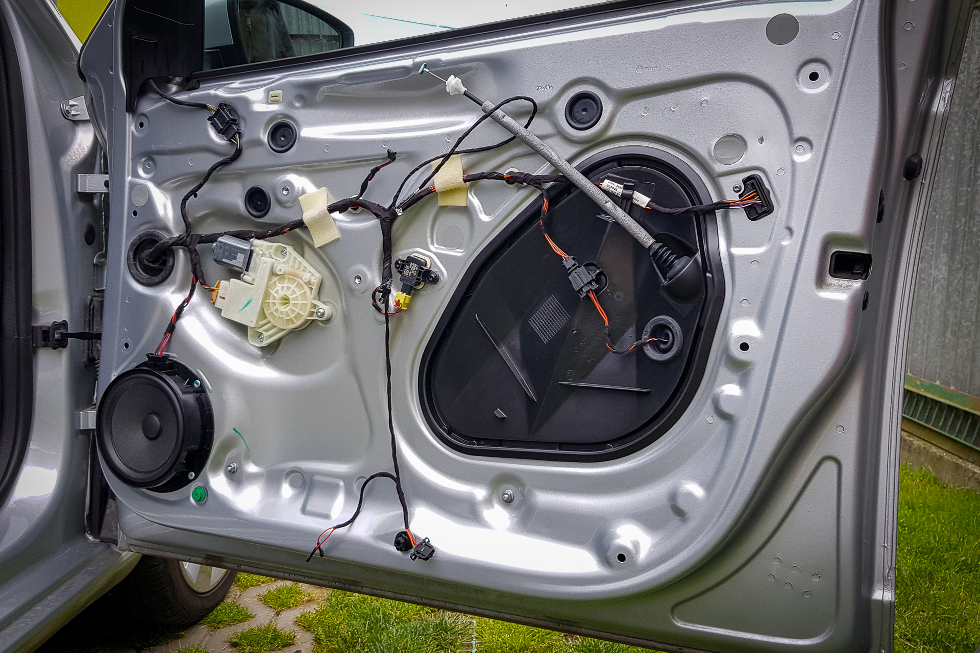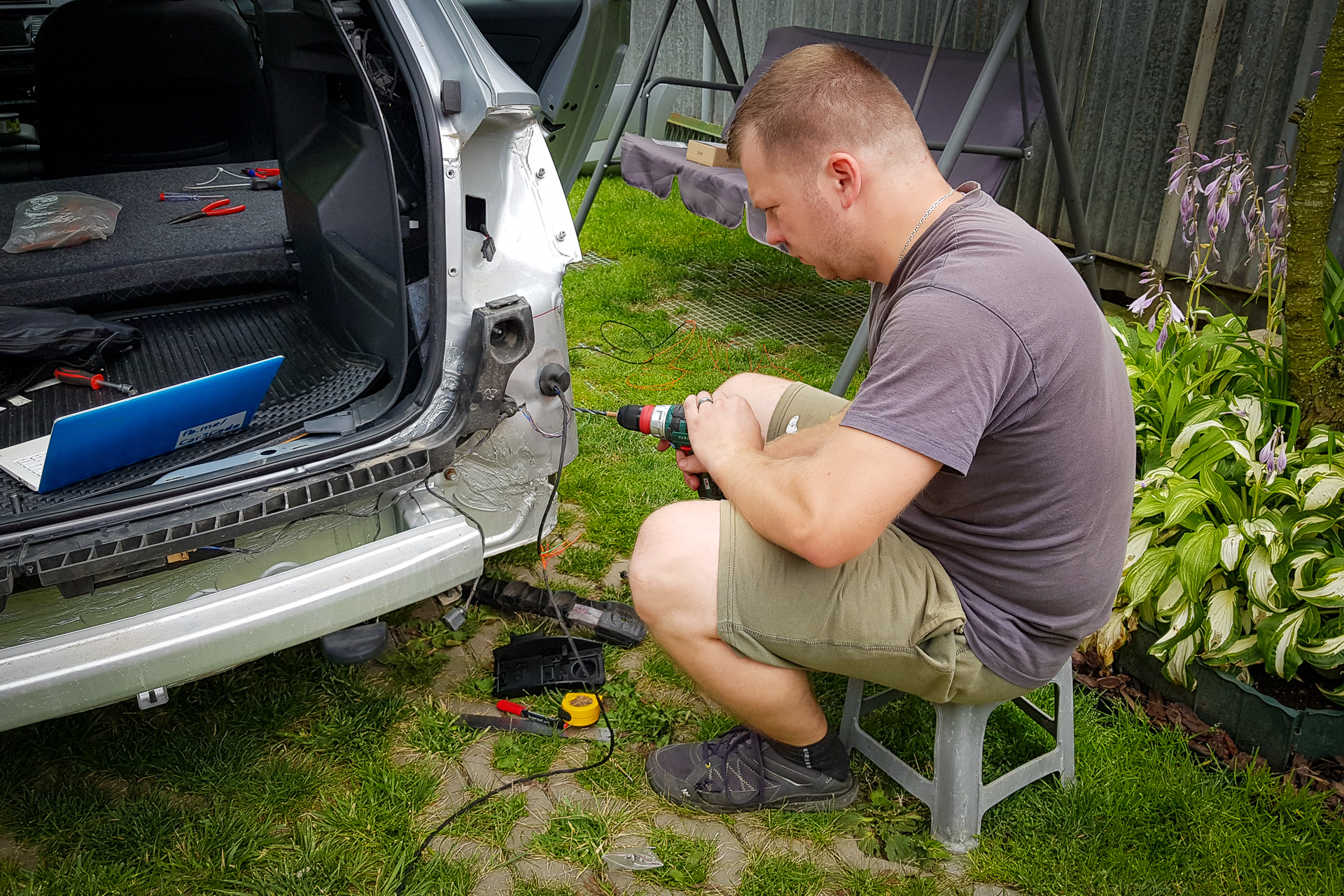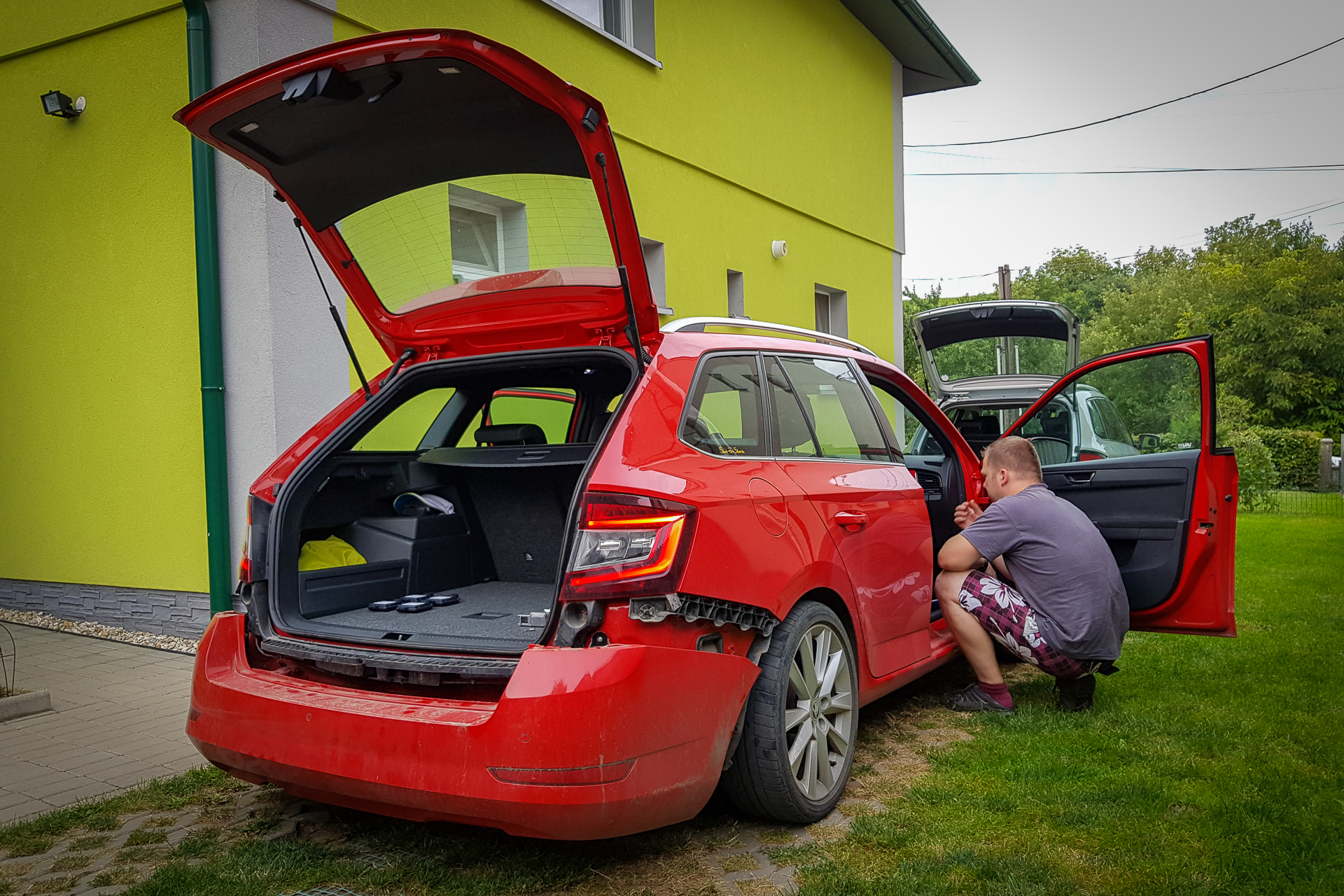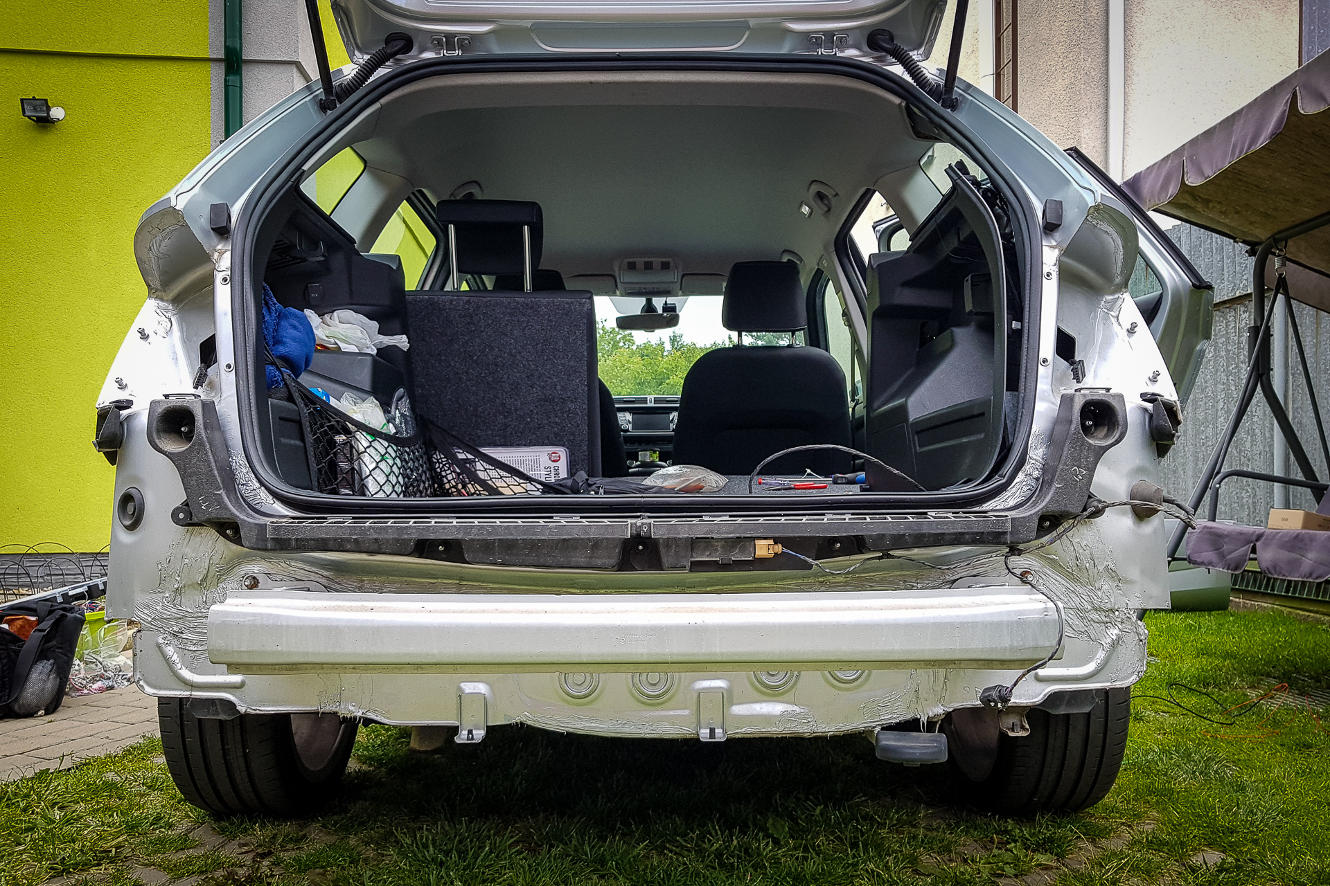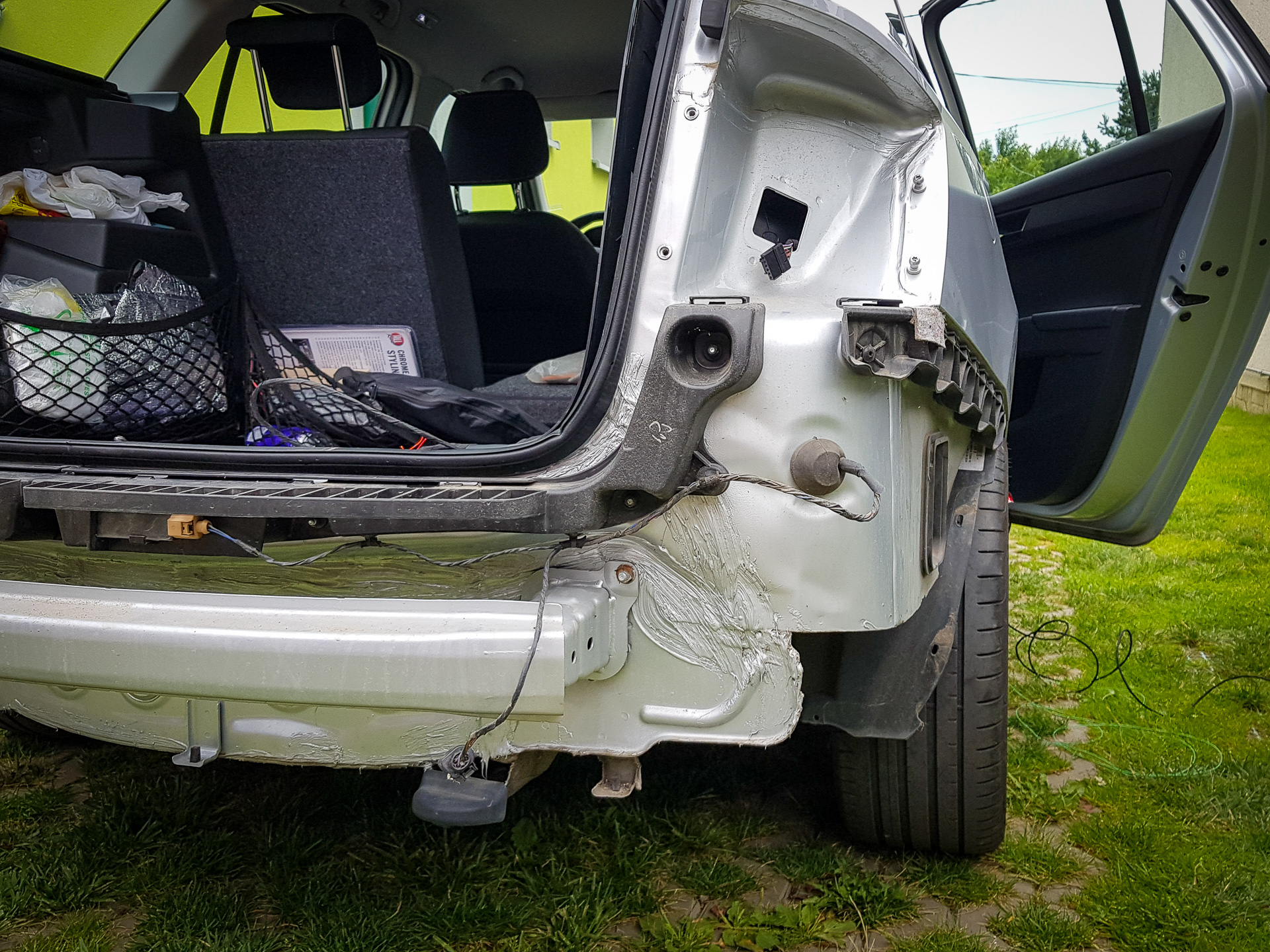 Úvod sa niesol hlavne v znamení káblovačiek. Zadok auta sa opätovne prepojil káblom s BCM jednotkou pod volantom, navyše bolo potrebné natiahnuť aj kábliky k vonkajším spätným zrkadlám. Tie dostali nové zrkadielka s dvoma autíčkami. Na záver sa navŕtali držiaky pod zadný nárazník, avšak radary nestihli prísť, preto držiaky zostali prázdne.