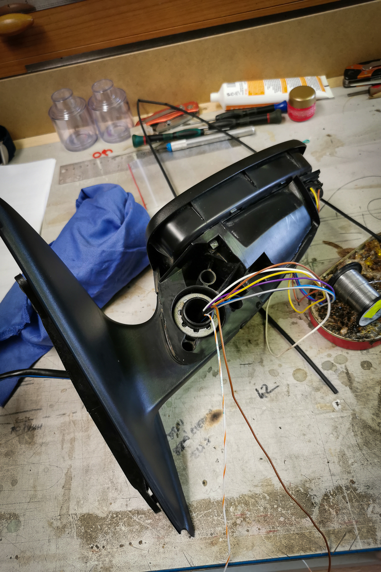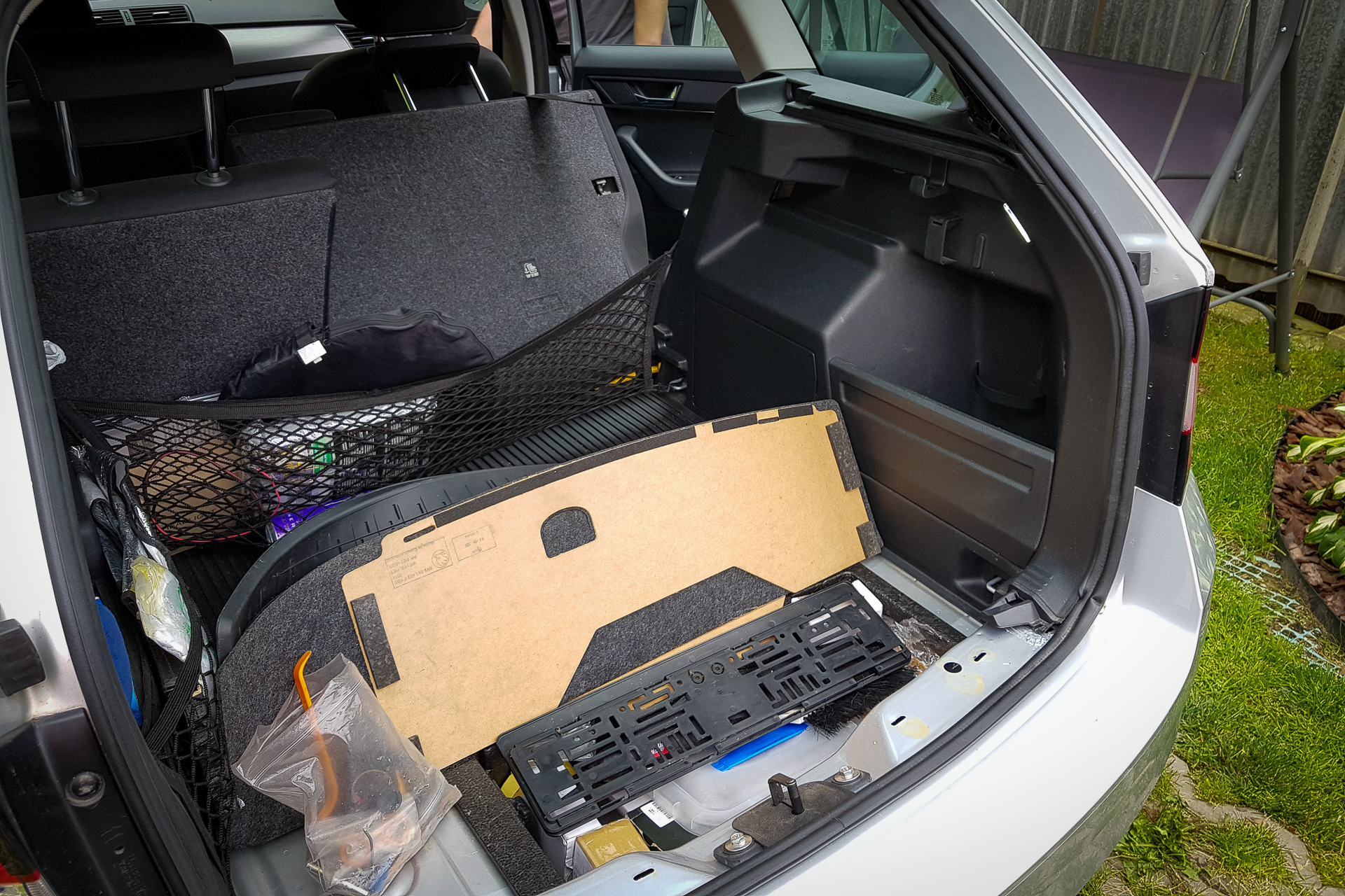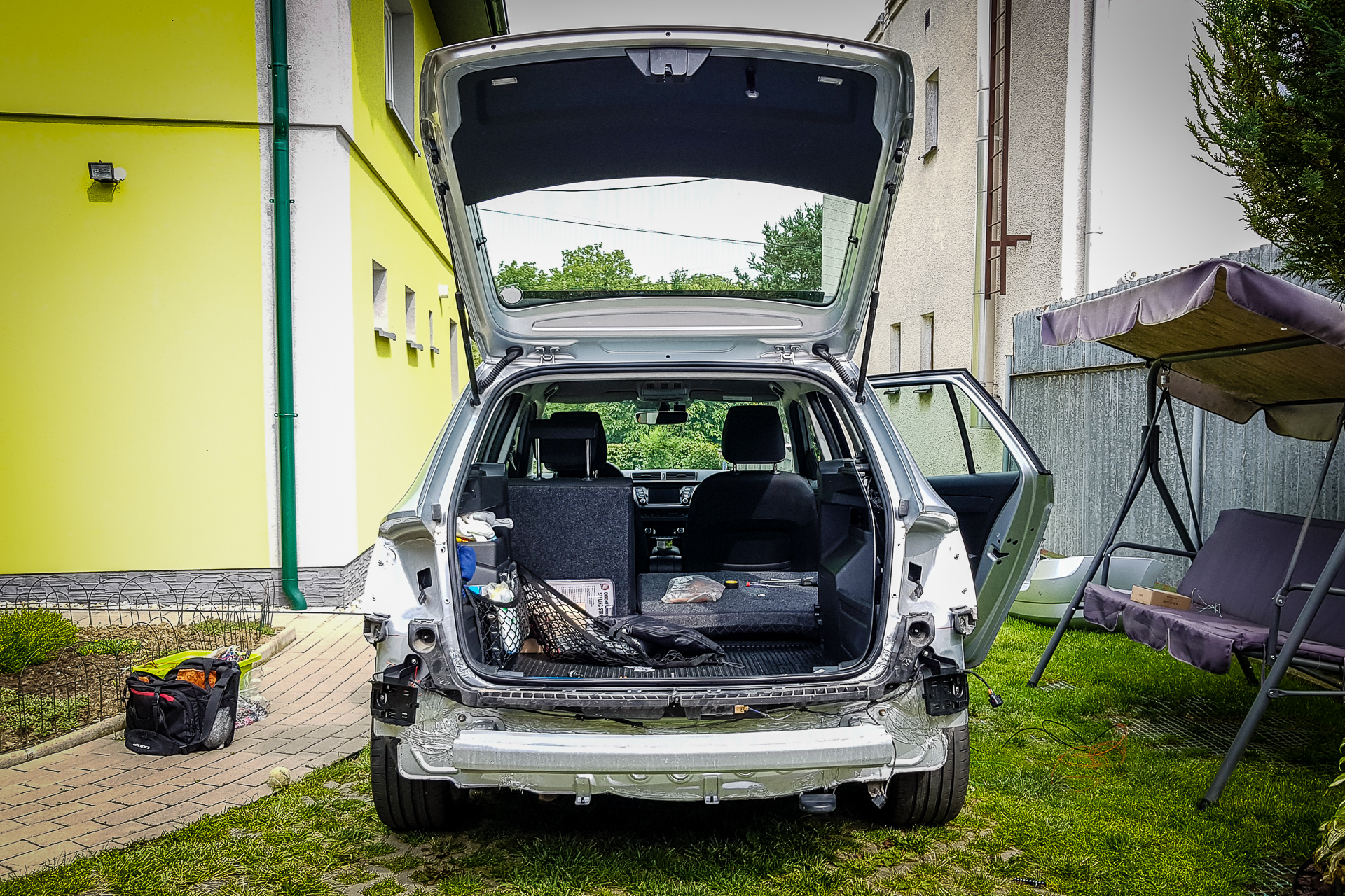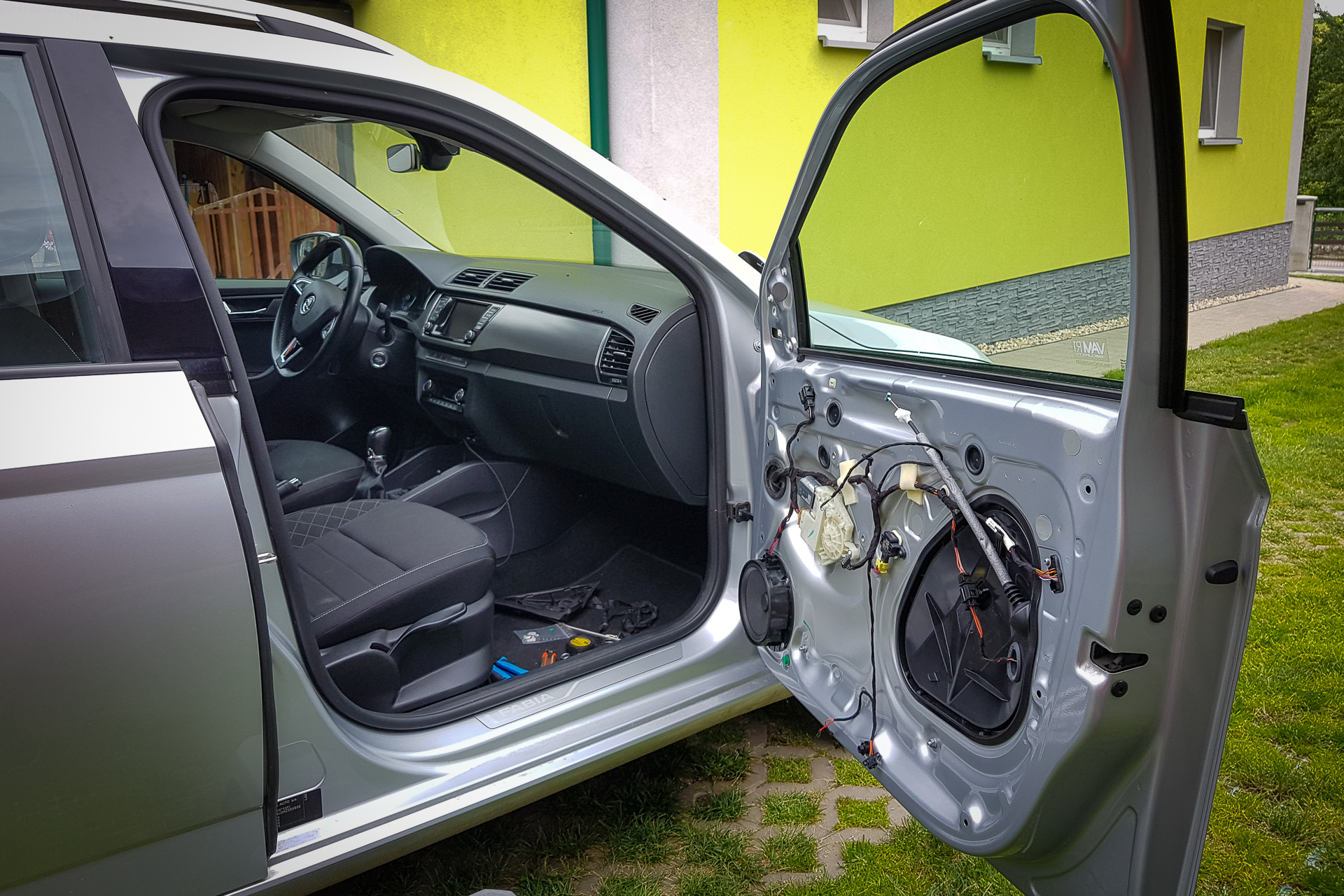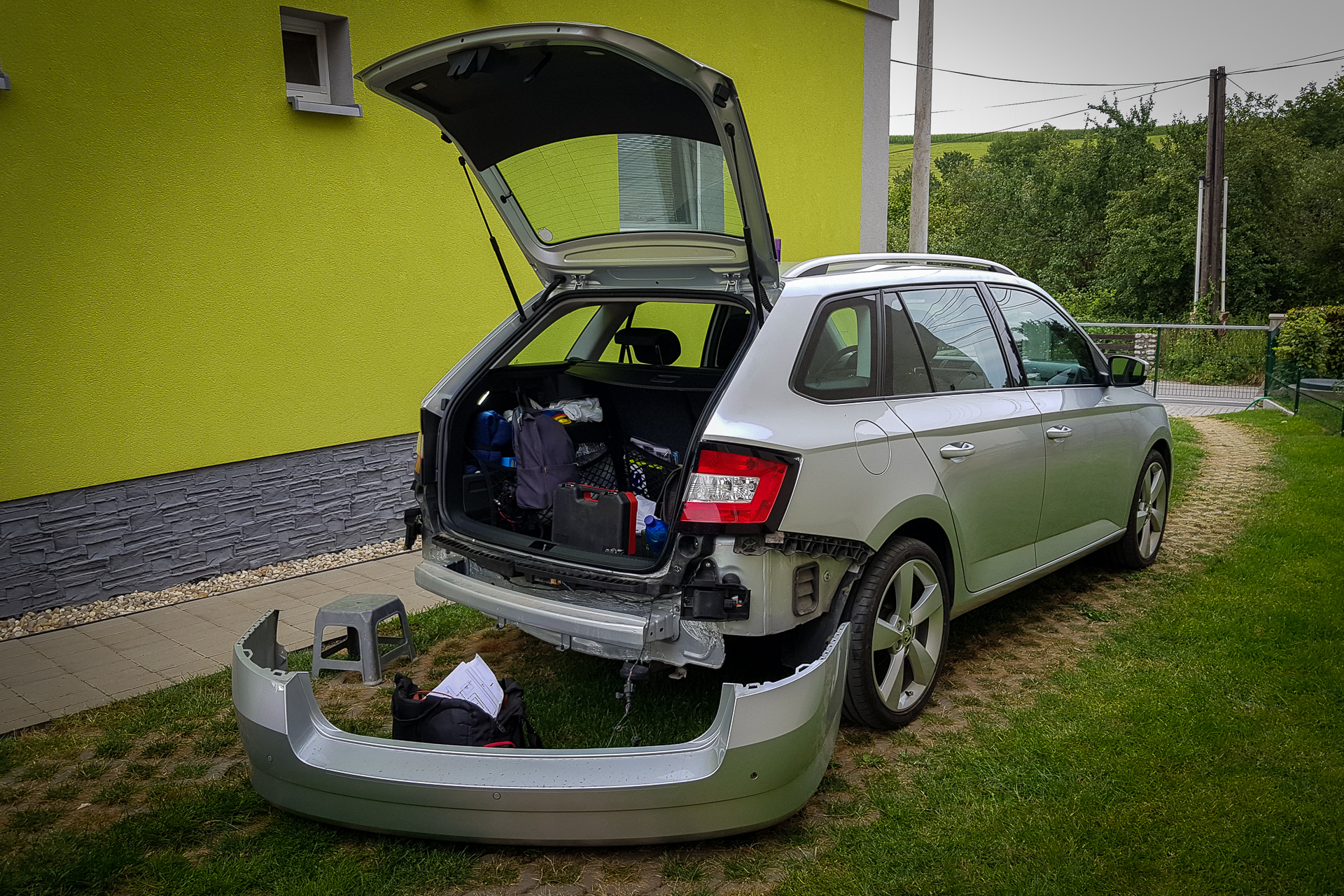 Úvod sa niesol hlavne v znamení káblovačiek. Zadok auta sa opätovne prepojil káblom s BCM jednotkou pod volantom, navyše bolo potrebné natiahnuť aj kábliky k vonkajším spätným zrkadlám. Tie dostali nové zrkadielka s dvoma autíčkami. Na záver sa navŕtali držiaky pod zadný nárazník, avšak radary nestihli prísť, preto držiaky zostali prázdne.