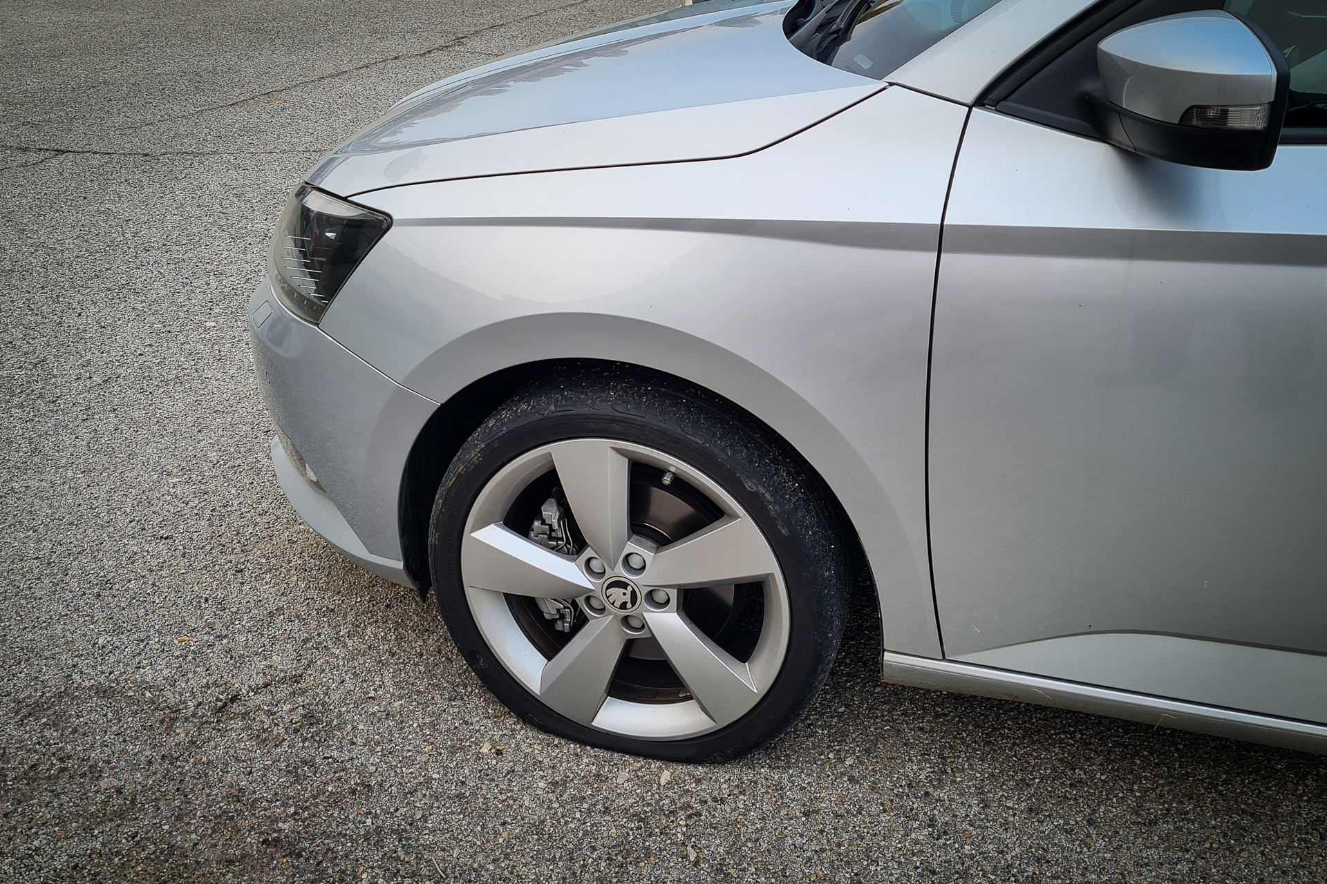 Ale po práci nás čakalo nepríjemné prekvapenie. Hneď ľavá predná pneumatika úplne sfúknutá. Nuž sme museli pokrstiť zatiaľ nepoužitú rezervu!