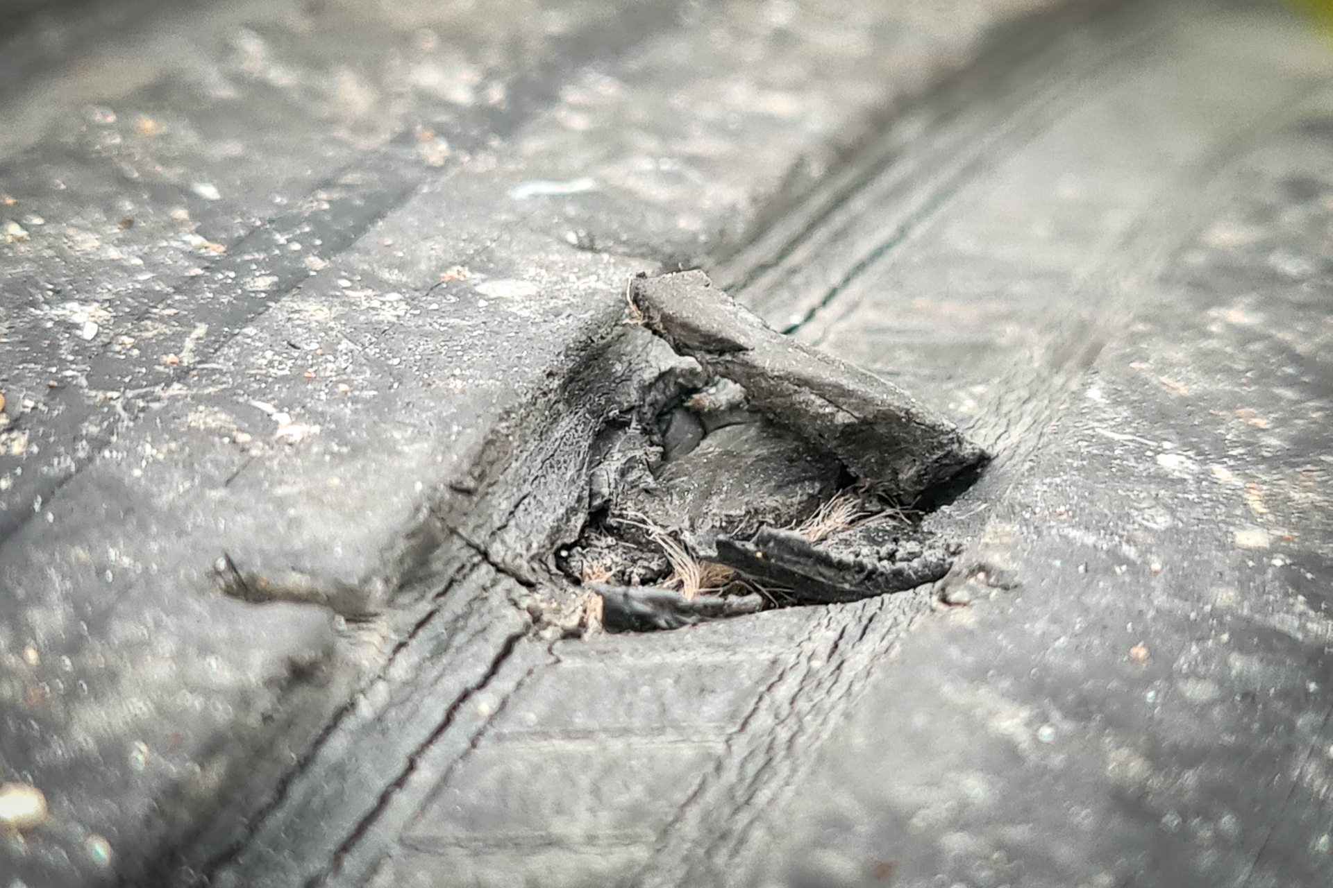Pneumatika nemala žiadne nové viditeľné poškodenie, pravdepodobne len povolila minuloročná záplata. Pneumatika už sa neoplatí opravovať, pôjde rovno do koša.
