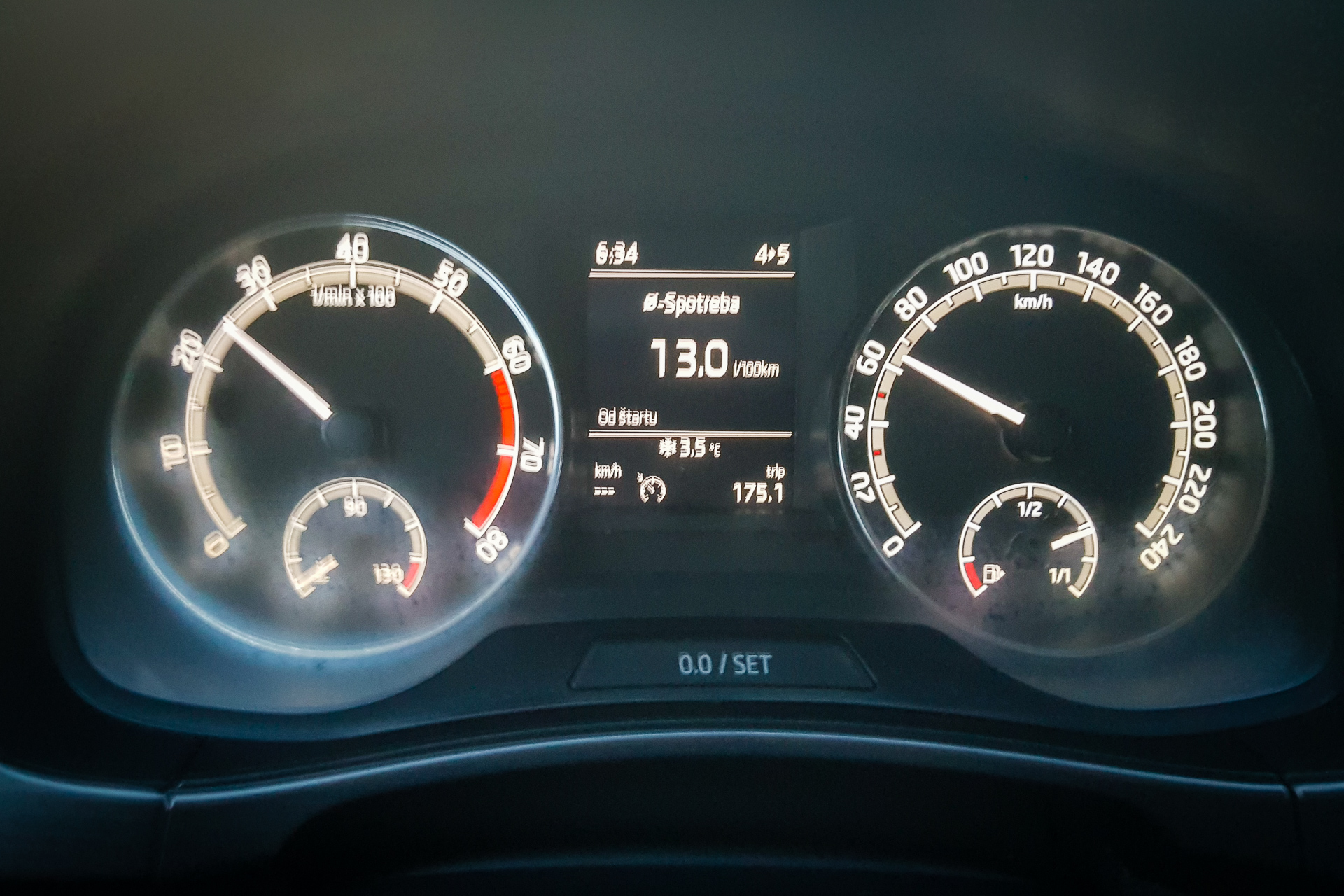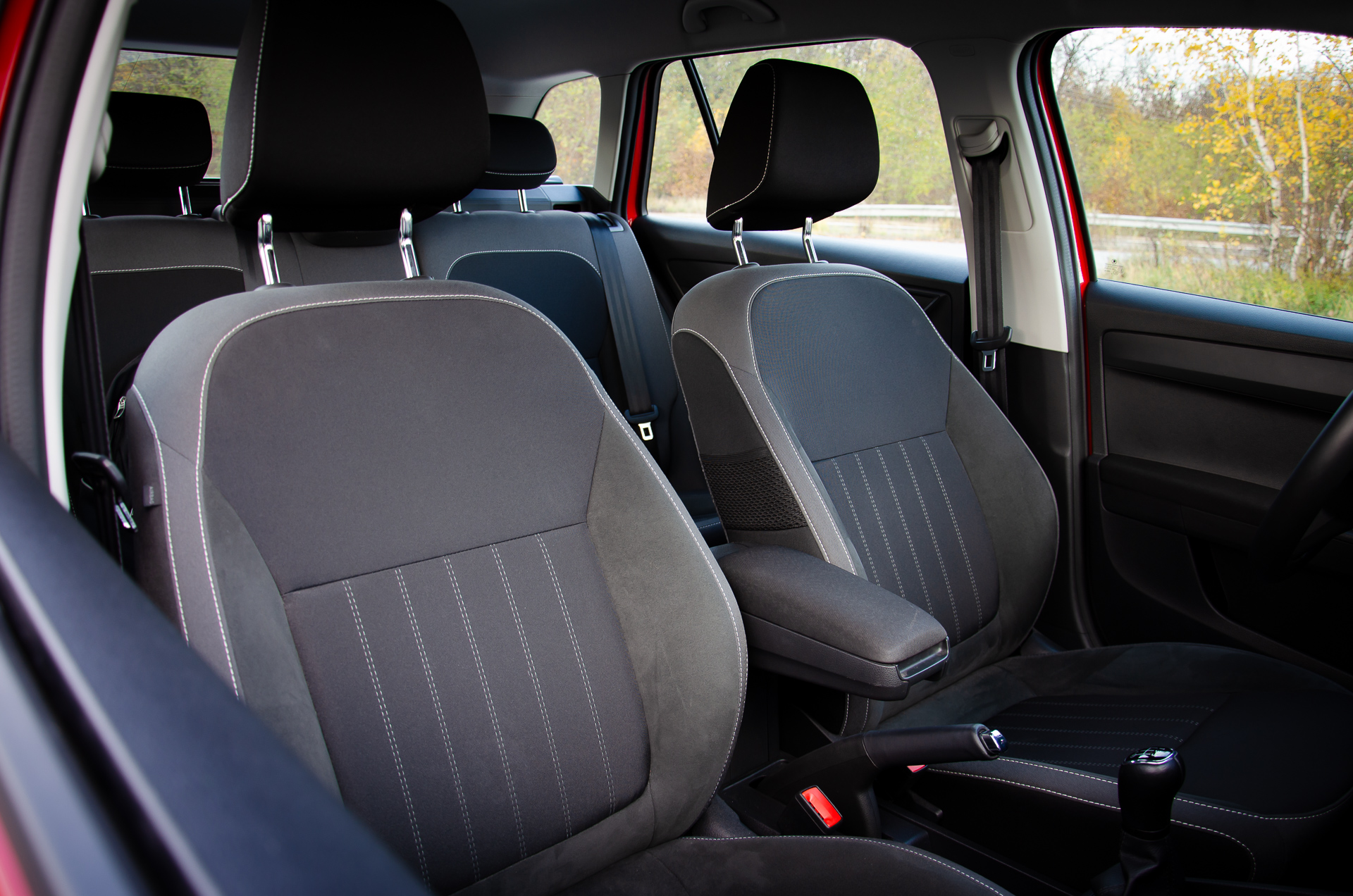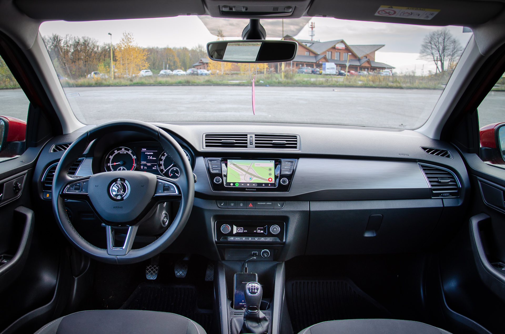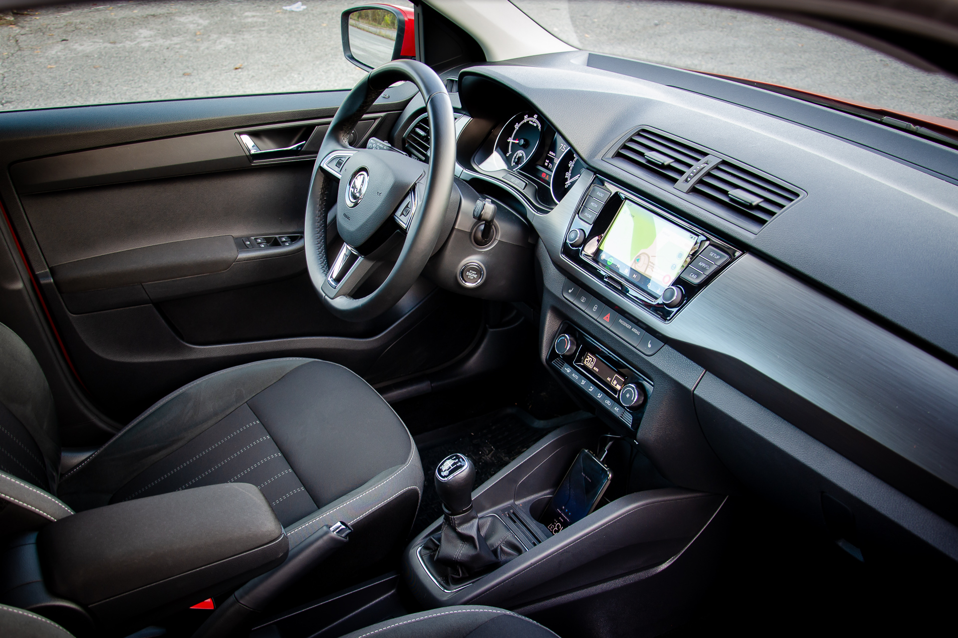 Interiér bol takmer identický s mojim. Akási imitácia kože na okrajoch sedačiek je veľmi príjemná na dotyk, len by som uvítal inú farebnú kombináciu. Zapáčilo sa mi osvetlenie odkladacieho priestoru v strede pod rádiom. Už som dal na neho objednávku aj do svojho auta. Klíma svišťala úplne rovnako ako moja, pravdepodobne tiež mala poľský kompresor značky Sanden. Trochu nemilé prekvapenie bolo jedno ráno, kedy som necelé dve minúty sedel v naštartovanom aute, ale záhadne sa stihli zarosiť budíky aj vnútorné spätné zrkadlo. Na svojej Fabii som to nikdy nepostehol. Takmer celú dobu pršalo a tak ma akosi ani neprekvapila mláčka vody na spolujazdcovom koberčeku. Pravdepodobne tam natieklo cez nasávací otvor ventilácie.