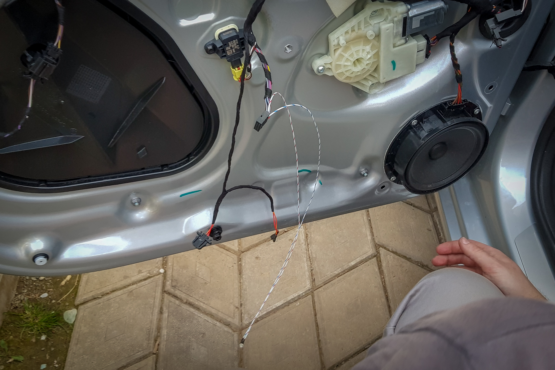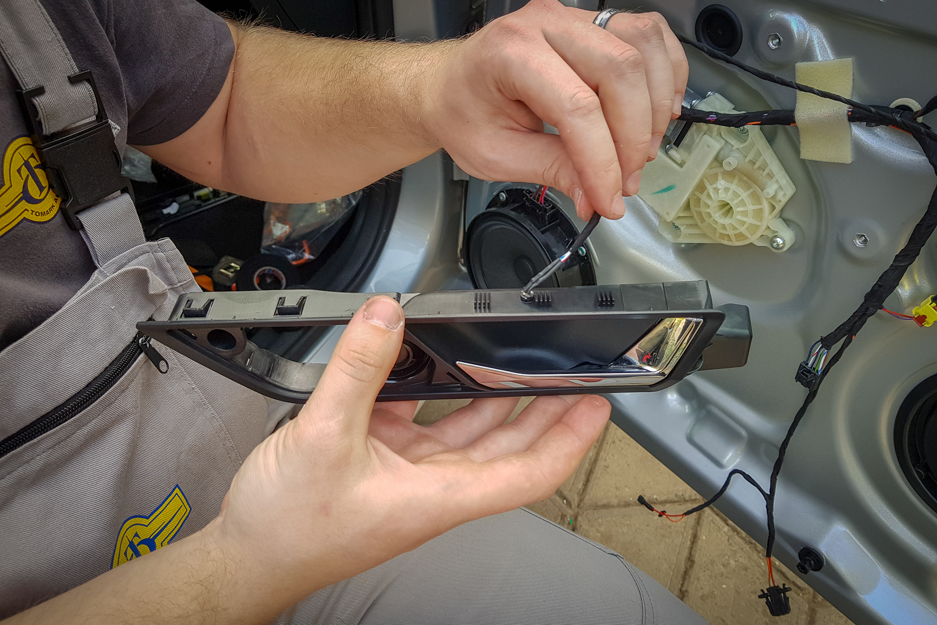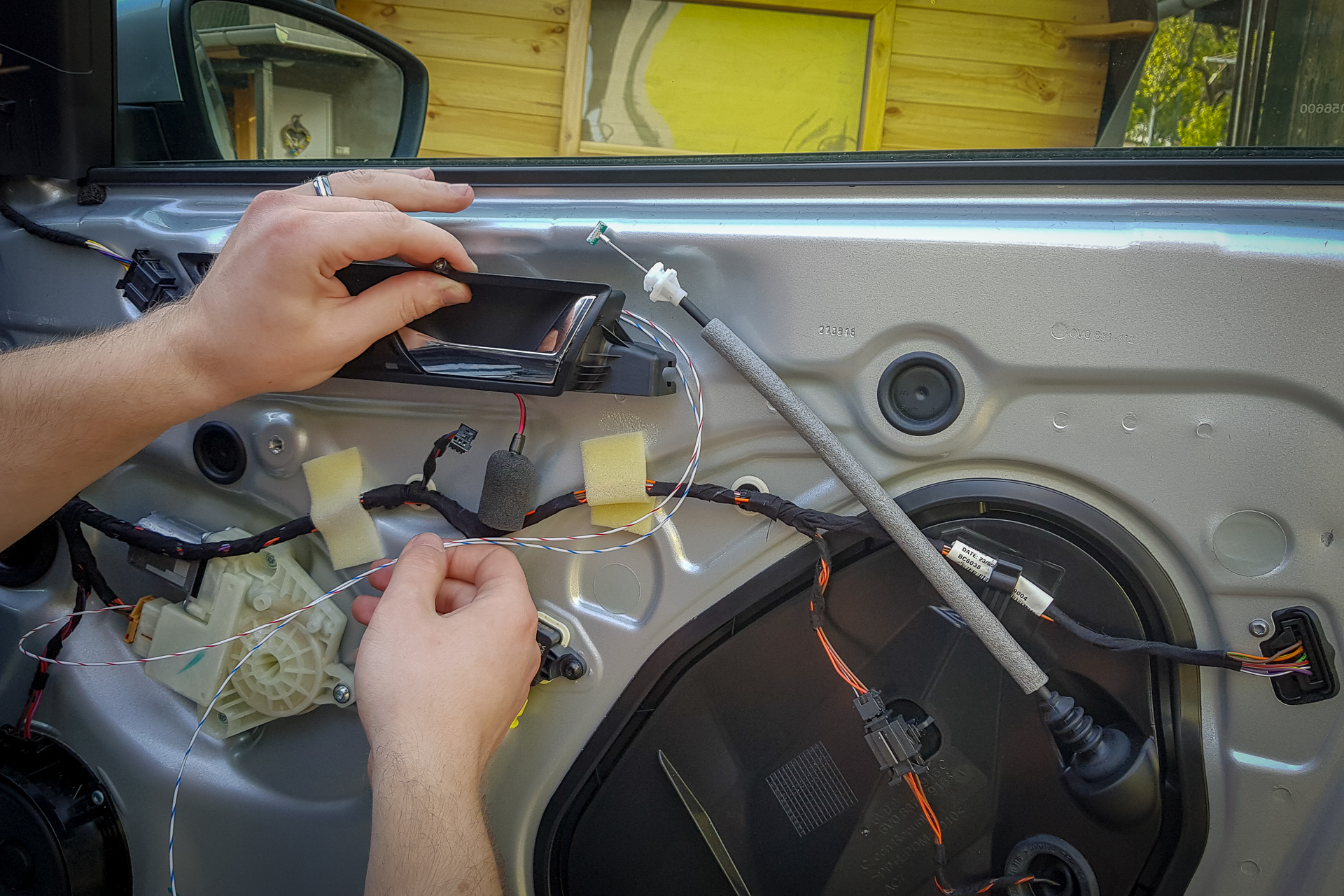 Samozrejme na montáž bolo potrebné zhodiť výplne všetkých dverí, odmerať správnu dĺžku káblov, do kľučky spraviť malý otvor na ledku. Kabeláž sa pripájala na osvetlenie interiéru, aby ledky svietili iba spolu s interiérovým osvetlením a aby ich intenzita mohla byť regulovaná spolu s osvetlením interiéru.