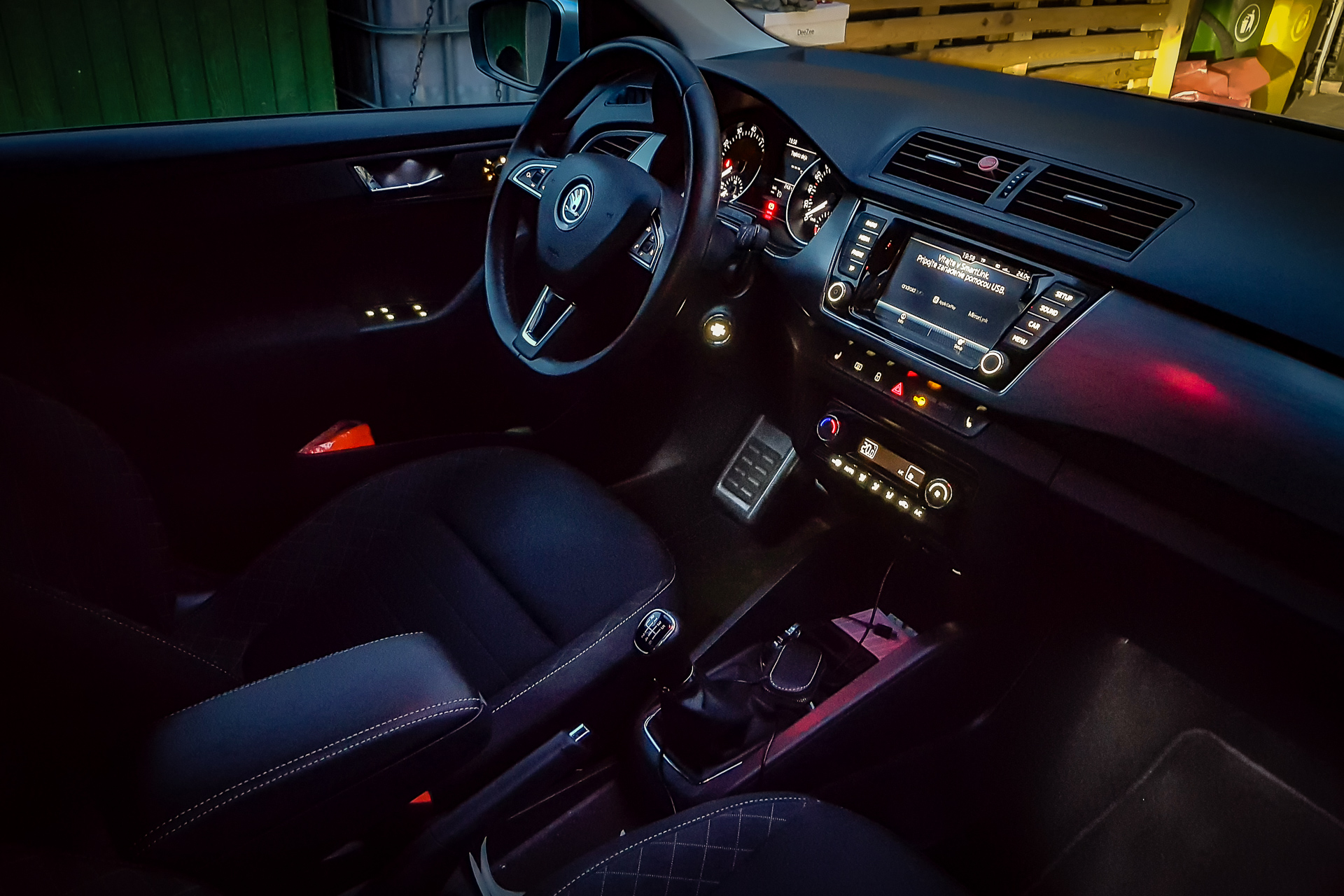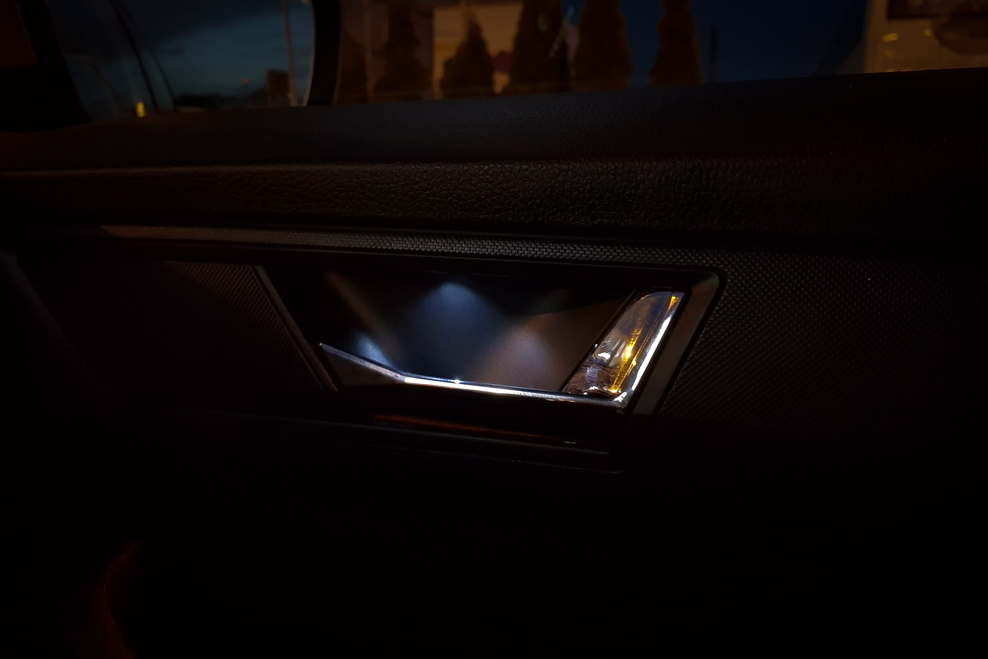 Minulý mesiac pribudli ďalšie nové ledky v interiéri – tentokrát decentné podsvietenie vnútorných kľučiek dverí. Na podsvietenie sa použili ledky a rezistory na zníženie intenzity lediek, ktoré boli zakúpené v miestnej predajni rádioamatéra. Kabeláž pripravil ako inak wirer.
