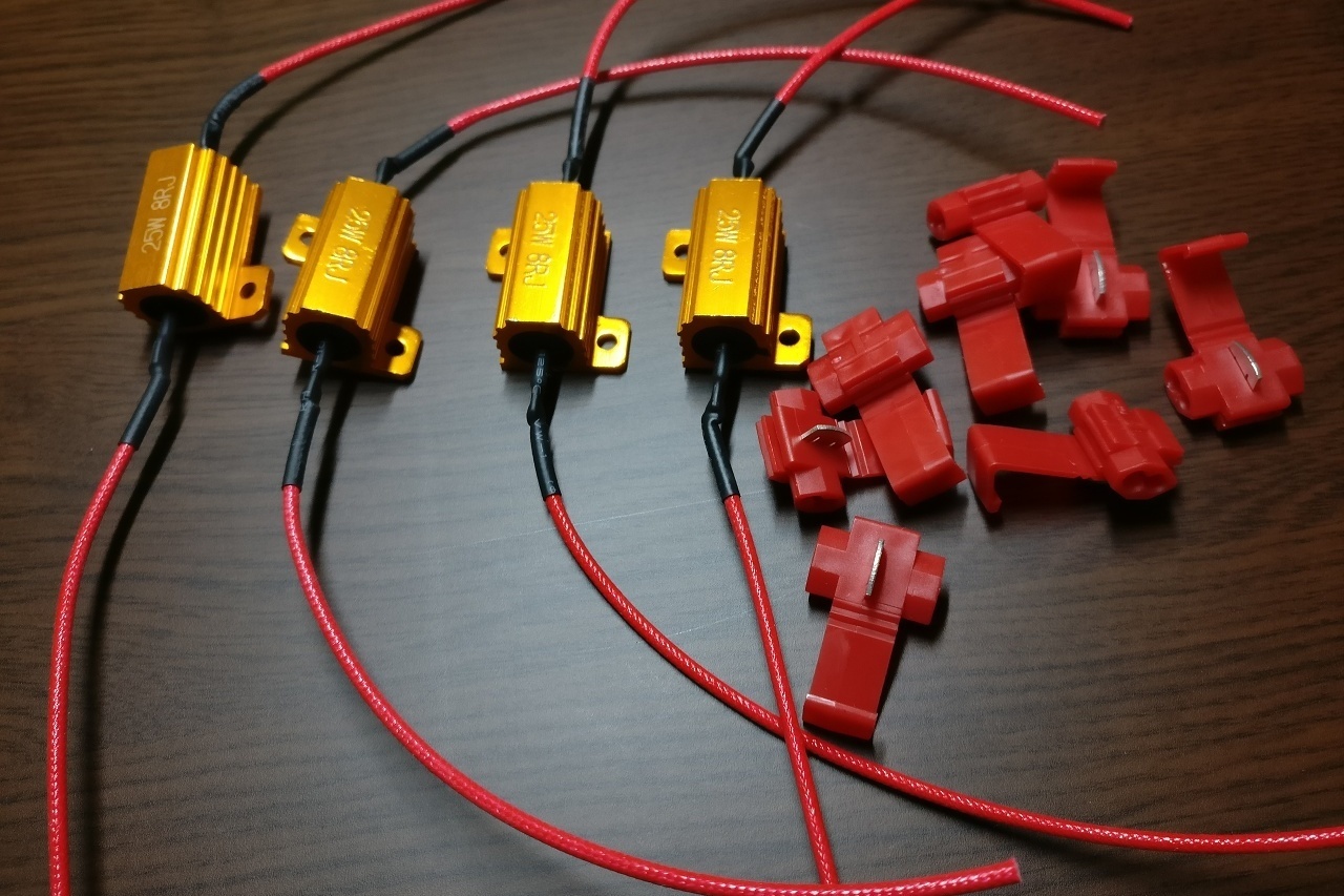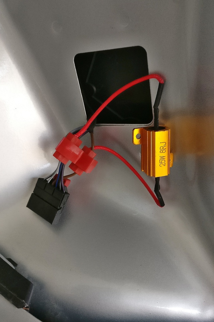 Dnes také naprt počasie, tak som sa konečne pustil do spiatočiek, konkrétne do ich zapojenia cez rezistory (AliExpress), aby nehlásilo chybu. Snažil som sa postupovať presne podľa tohto poľského návodu. Rezistory už som nosil v kufri asi od zimy, prvý pokus ich montáže nebol úspešný, keďže originál kabeláž v aute má dosť hrubú izoláciu a tie „pripináčiky“ ich nedokázali poriadne prepichnúť. Následne začalo pršať, tak som to odložil na neskôr. K druhému pokusu som sa dostal až dnes. Trochu som narezal izoláciu a rezistory priamo nacvakal na odizolované drôtiky… konkrétne hnedý a čierny s modrým pásikom.