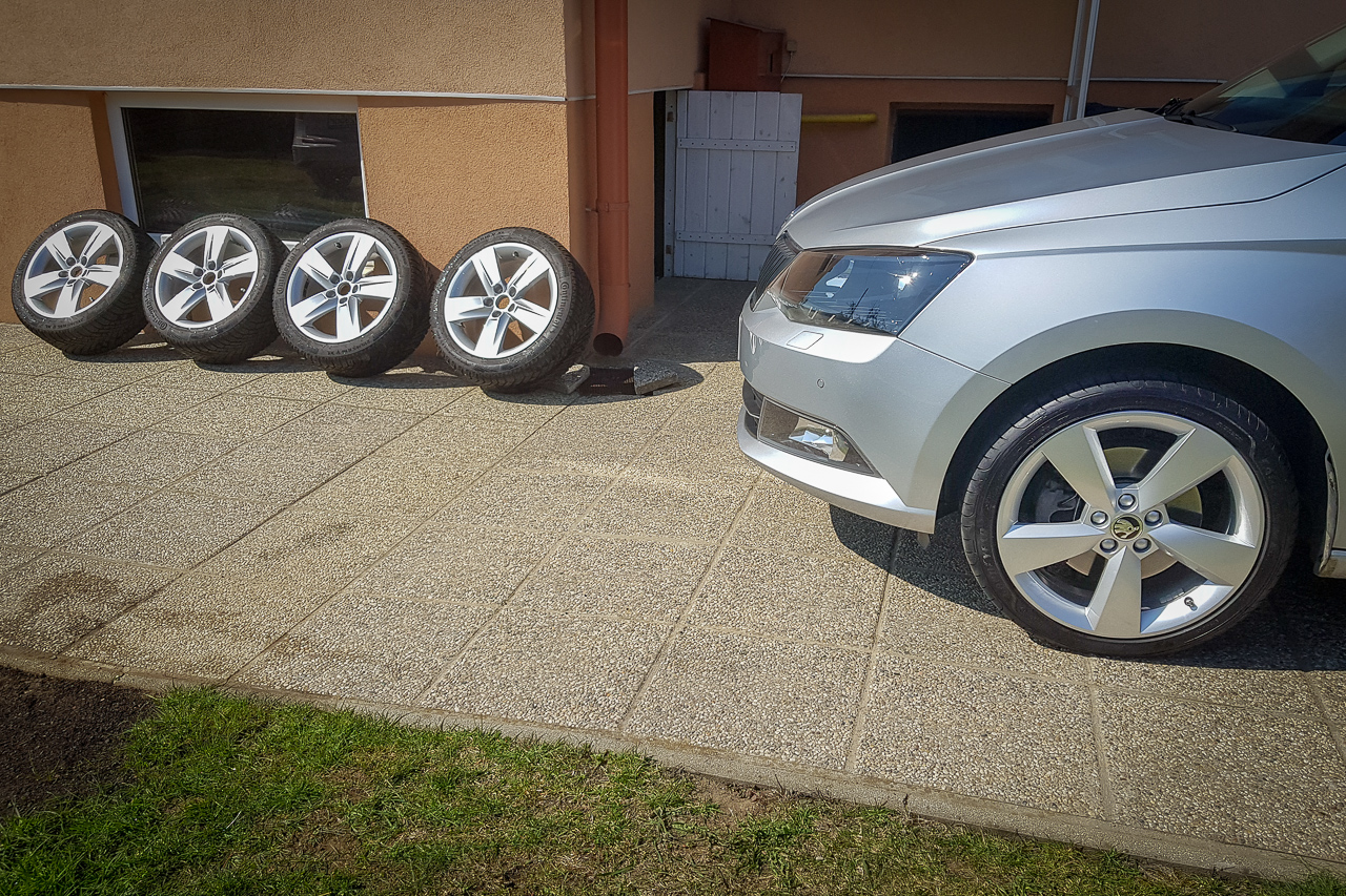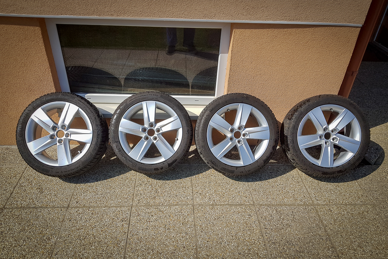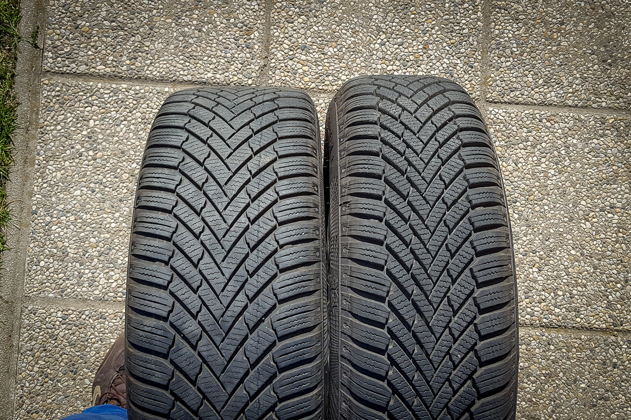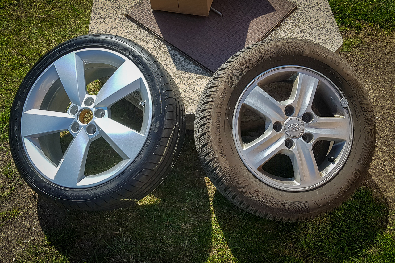 Na záver nejaké porovnanie – najskôr škodovácke Cameloty R17 s pneu 215/40/R17 vs. zimné hyundai disky R15 s pneu 185/65/R15, druhá foto dezén Continental TS860 šírka 215/40 po dvoch sezónach (cca 13000 km) vs. šírka 185/65 po prvej sezóne (cca 3000 km).