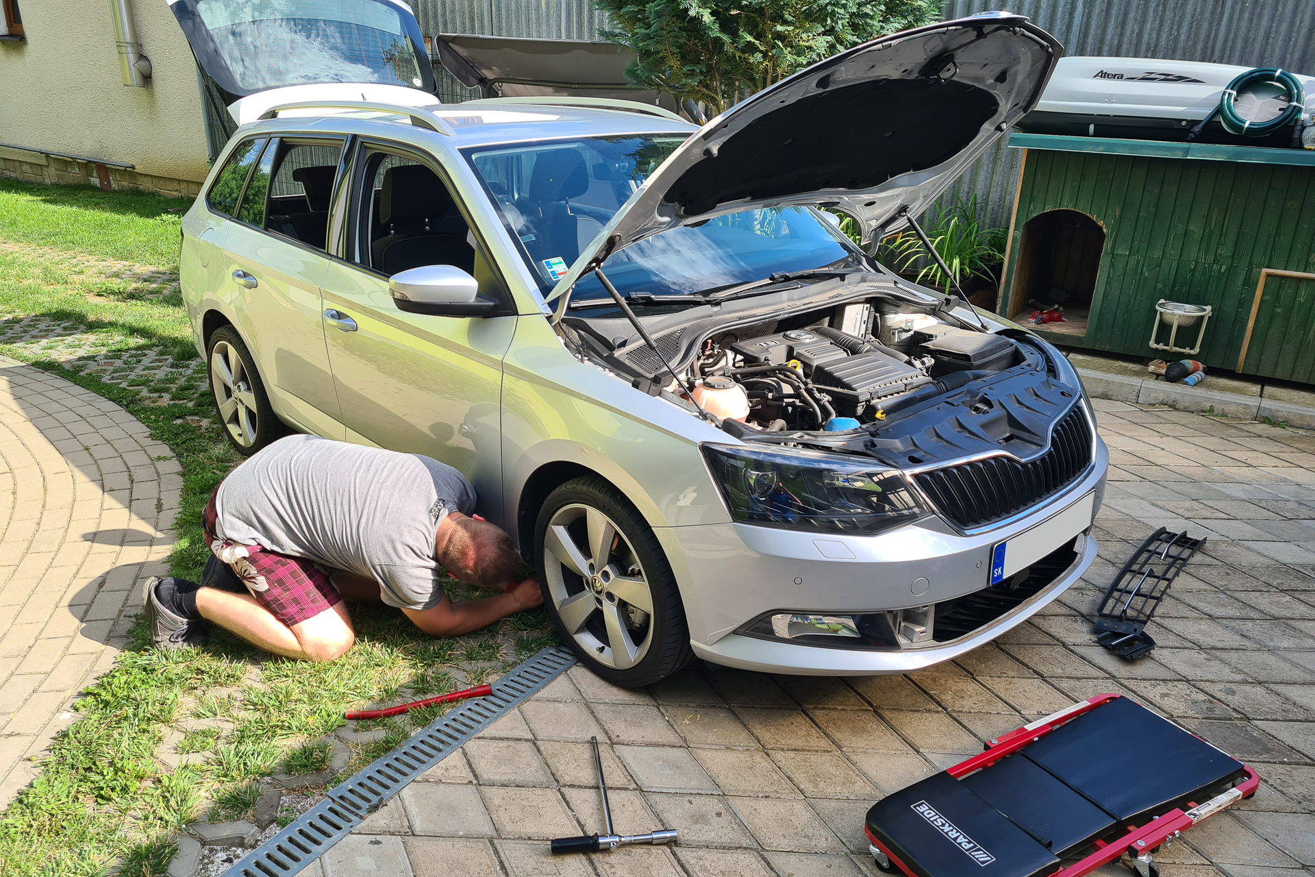 Nový senzor sme objednali, ale nestihol prísť do termínu u wirera. Našťastie wirer mal v zásobe nejaké zvyšné senzory a jeden dočasne zapožičal. Chybný bol vnútorný senzor, ku ktorému sa kvôli polystyrénu na výstuhe nedalo dostať cez spodnú mriežku a bolo potrebné zhodiť nárazník. Pre wirera našťastie žiadny problém. Stačilo nárazník uvoľniť len na jednej strane, ale aj tak muselo ísť dole koleso, podblatník, aj spodný kryt motora.