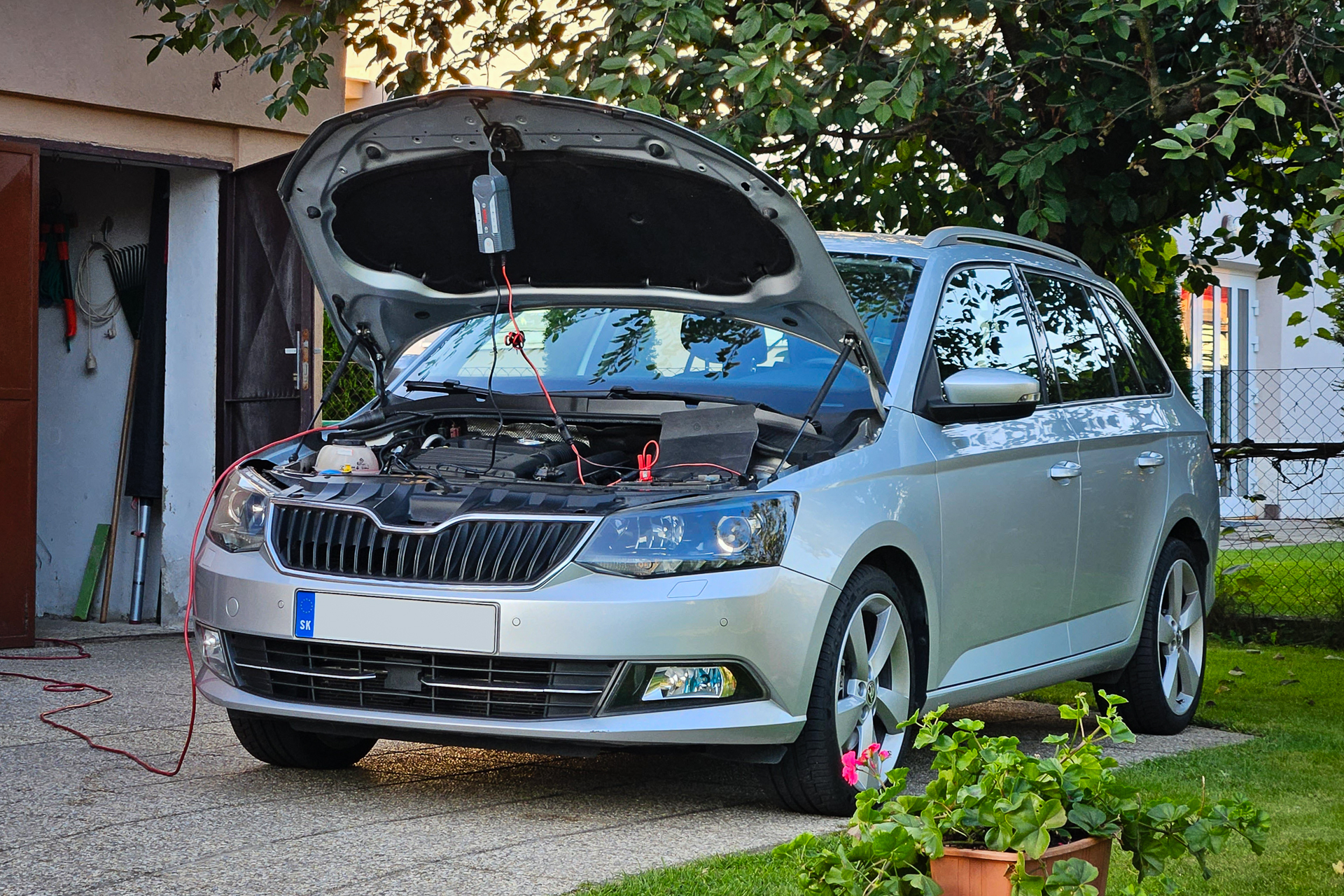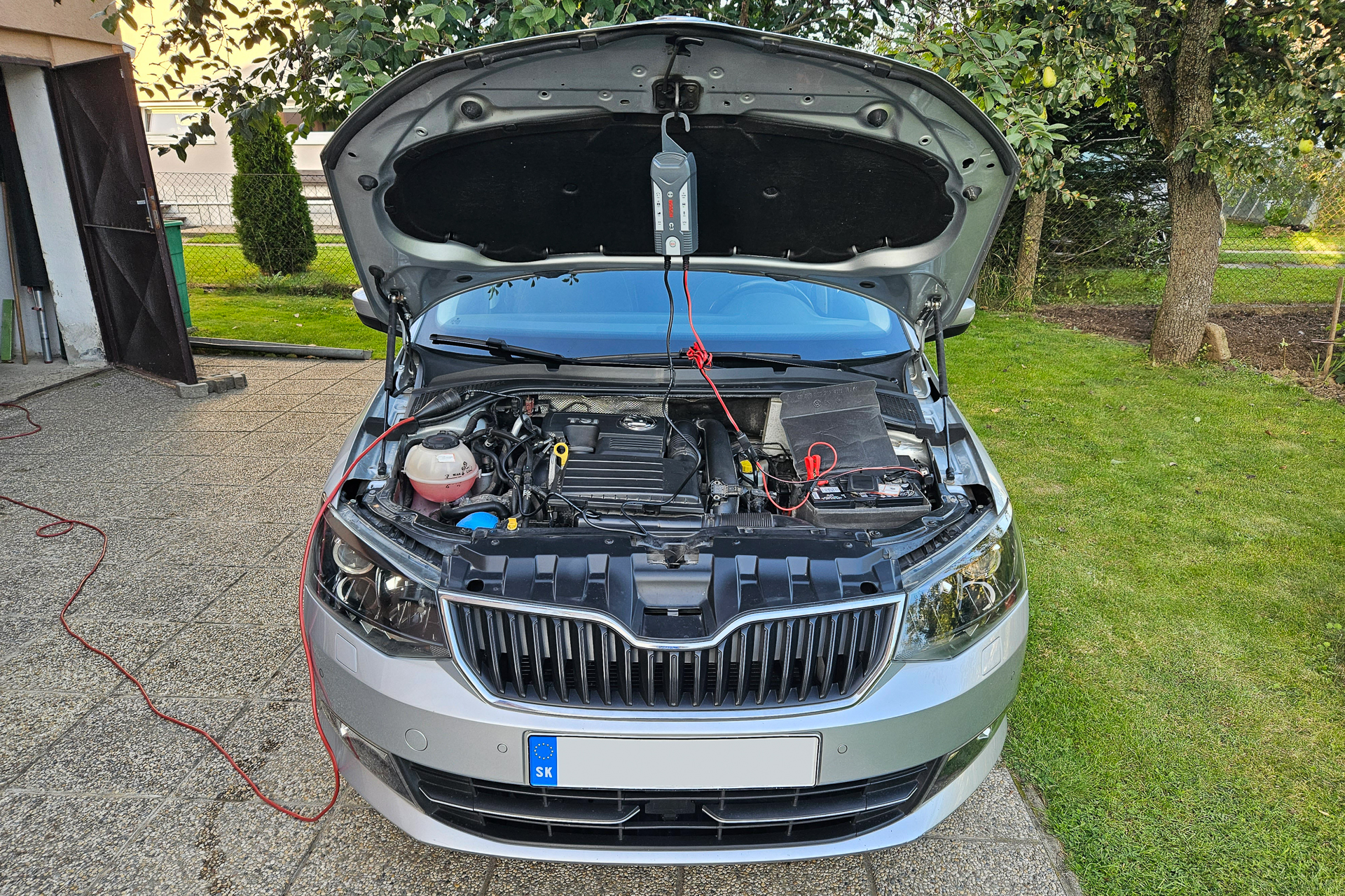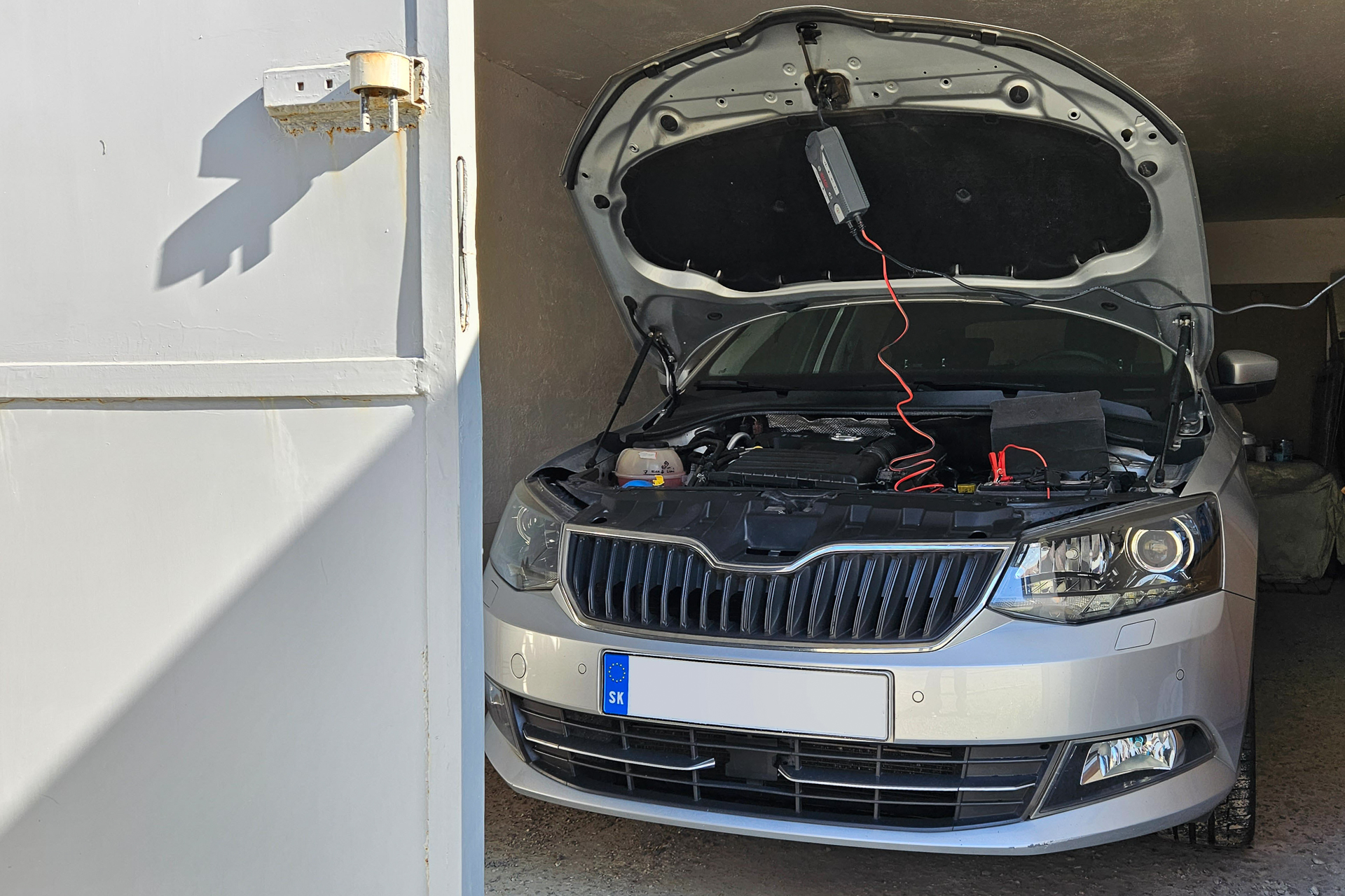 Nasledoval telefonát pre podporný tím s káblikmi, vďaka ktorým sme sa dostali na záhradu, kde sme to skúsili dobiť, aj keď nám všetkým bolo jasné, že pôvodná baterka od výroby (Banner 59Ah/640A) bude KO a pomôže iba nová. Ale keďže bol víkend, nemuseli sme sa nikde ponáhľať. Fabku sme nabíjali celé poobedie a večer šli domov aj so štartovacími káblami v kufri.