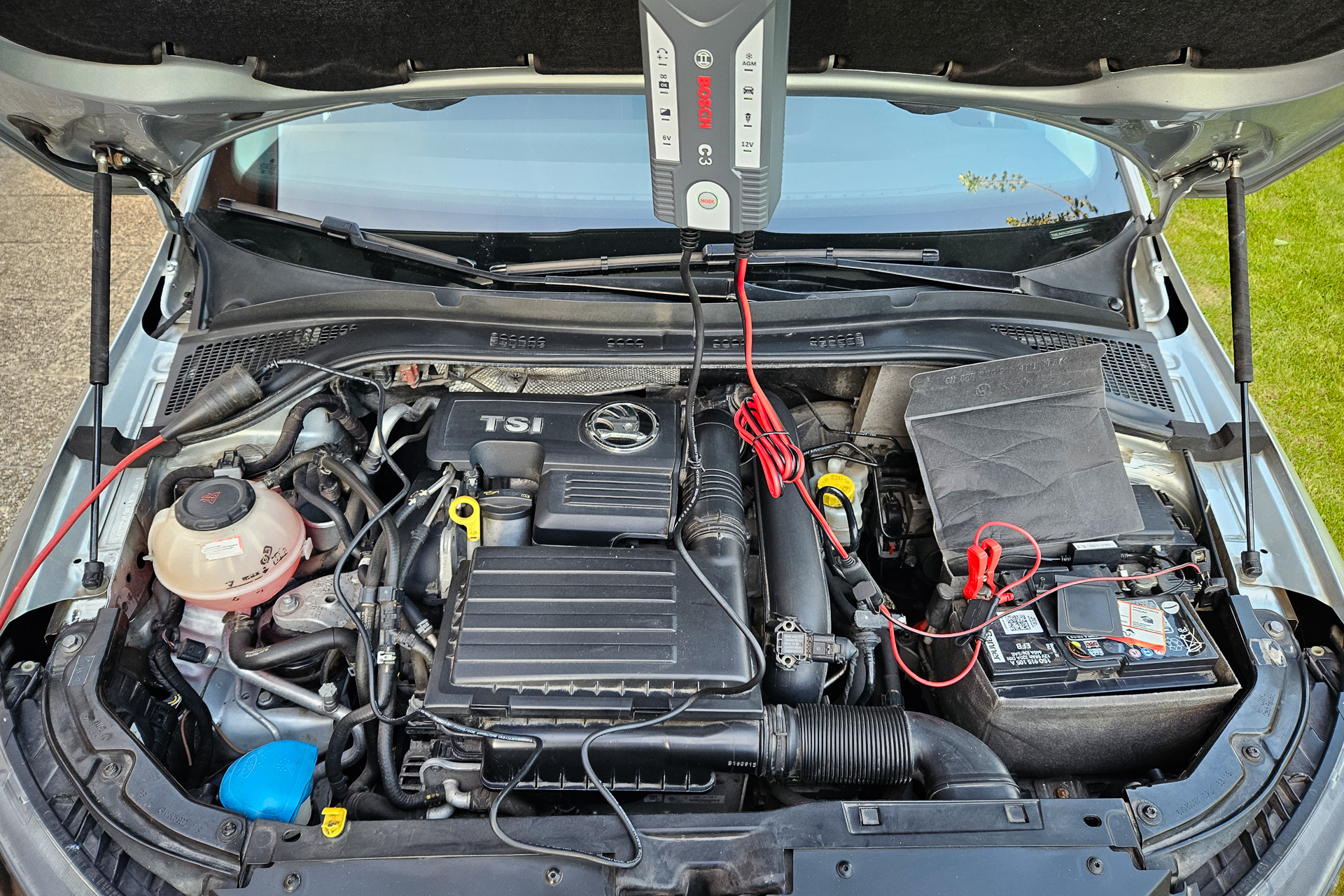 V nedeľu ráno sme mali 12,2V, po otvorení auta to padlo na nejakých 11,9V. Bohužiaľ ani to nám nepomohlo a tak opäť prišli na rad štartovacie káble. Len podotýkam, že minulú zimu v mrazoch sme úspešne naštartovali aj pri 11,8V, ale asi sme mali lepší prúd – s vekom prúd slabne asi aj na autobatériách. Fabka si to namierila rovno do garáže, kde sme ju opäť skúsili pichnúť na nabíjačku, avšak samozrejme ani to nepomáhalo.