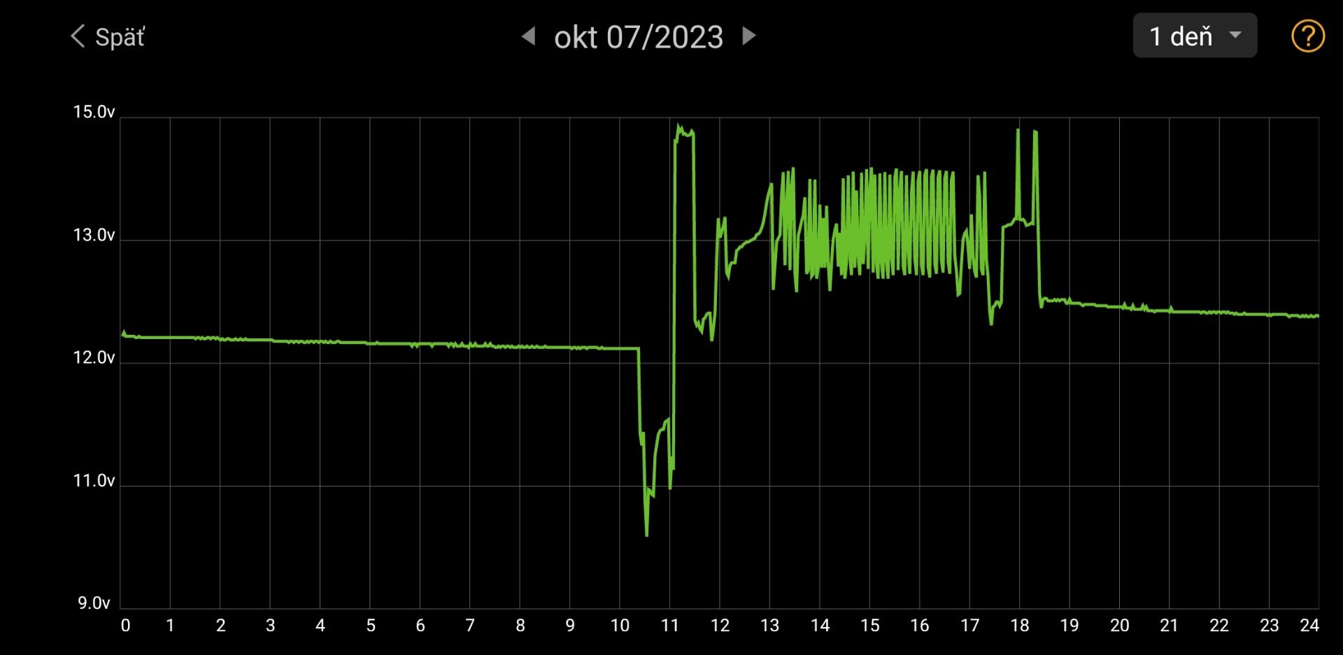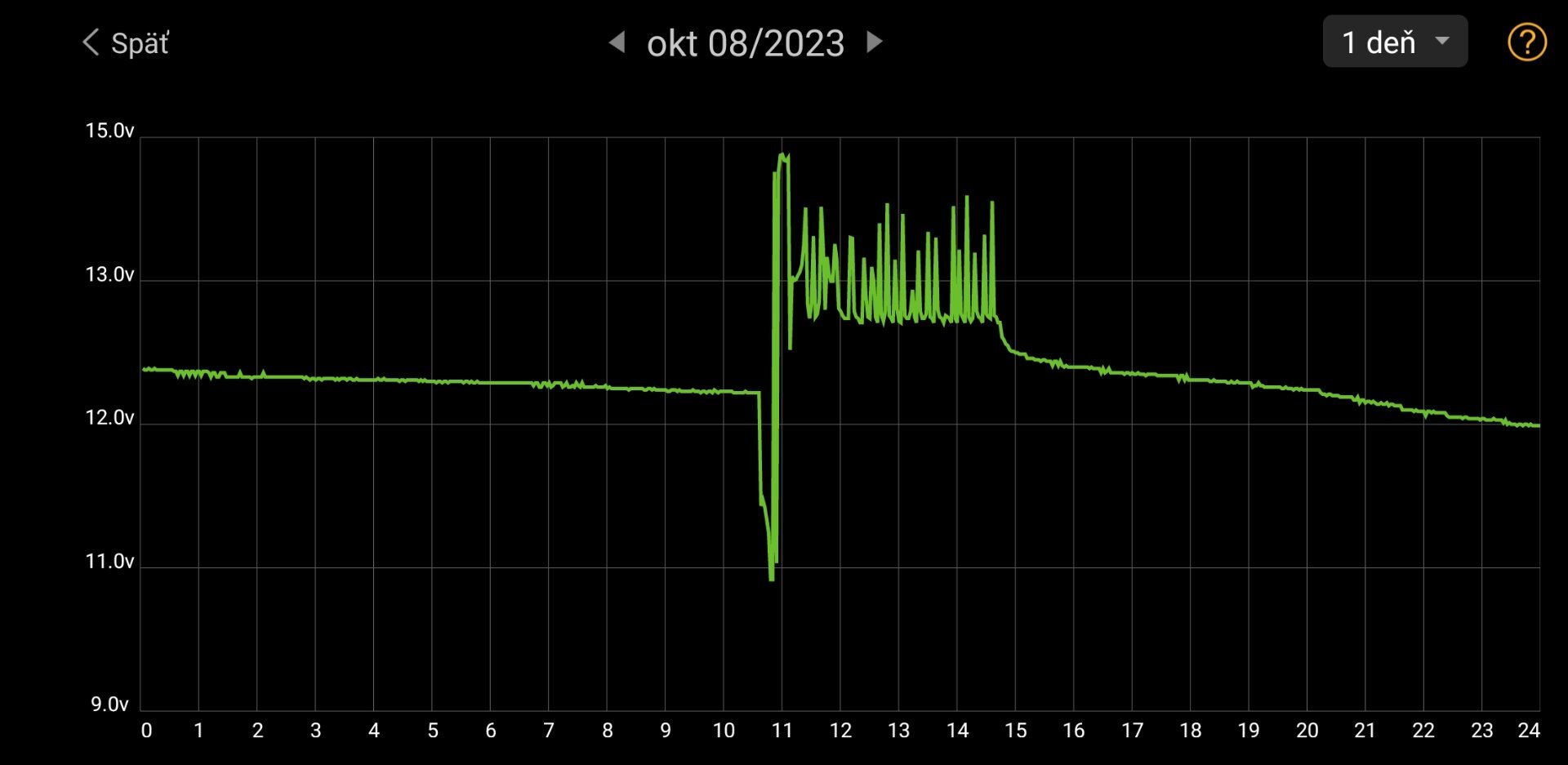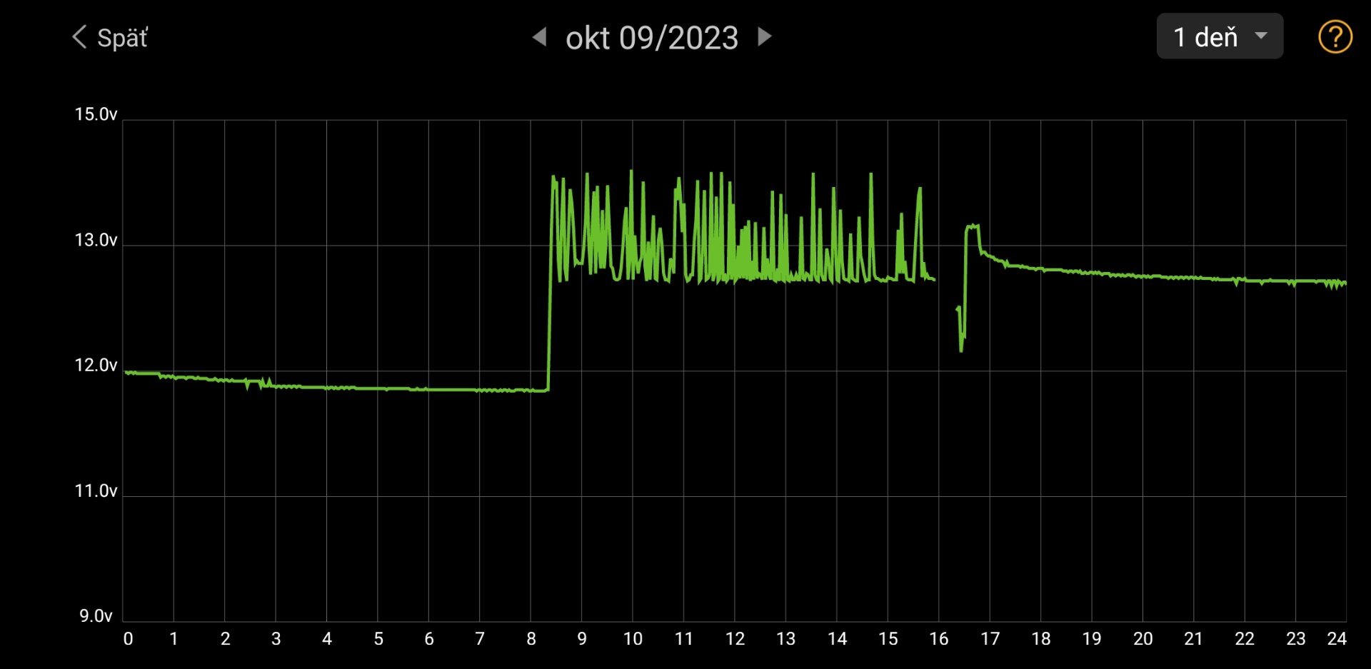 Menšia zaujímavosť, že ráno sa baterka správala normálne (13,3V/14,8V), ale po práci, keď boli teploty okolo 20°C, ukazoval voltmeter miesto 13,3V iba 12,1V a to aj po polhodinovej ceste na diaľnici. Neskôr sa to zdvihlo na 12,7V a ku koncu jazdy sa to vrátilo na 13,3V. Neviem, či je to normálne správanie novej baterky alebo len bolo potrebné baterku nakódovať. Uvidíme najbližšie dni.