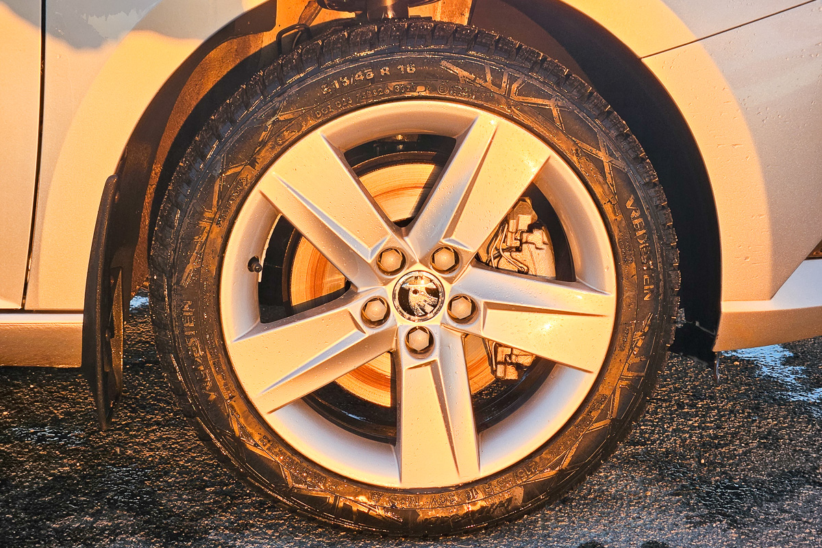 R16kový rozmer pre Fabiu je ten najnešťastnejší aký môže byť! Potrebovali sme vymeniť jeden pár dosluhujúcich starých contíkov za nové michelinky, ktoré by nám zapasovali k druhému páru micheliniek kúpenými pred 2 rokmi. Objednávku sme dali 21.10., sľúbená cena 180€/ks, ale ani týždeň pred vianocami nebol známy termín výroby a dodania. Nakoniec sme sa nadrbali a šli sme do niečoho iného. Rozhodli sme sa vyskúšať novú značku Vredestein, ktorú pretláča môj dodávateľ pneu s ročnou garanciou výmeny pneu, ak nastane akékoľvek poškodenie (defekt, pukeľ atď). A tak sme sa rozhodli, že obujeme Vredestein Wintrac 215/45 R45 90V DOT 3323 Made in Hungary, mokro B, valivý odpor C, hlučnosť 70dB, ktoré sme obuli minulý týždeň pri stave tachometra 103.377 km. Cenovo by sme mali ušetriť približne 50€/ks.