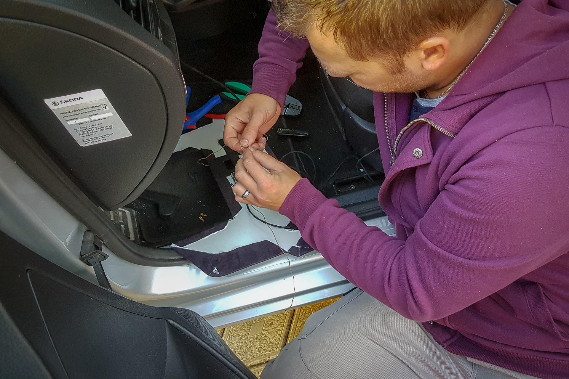 Na vodičovej strane nebolo potrebné veľa vymýšľať, držiak sa dá upevniť na pripravené miesto. Bolo potrebné predĺžiť kabeláž a vypínacie tlačidlo premiestniť na bočný plast nad madlo otvárania prednej kapoty.