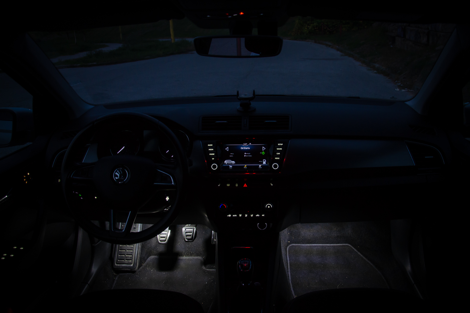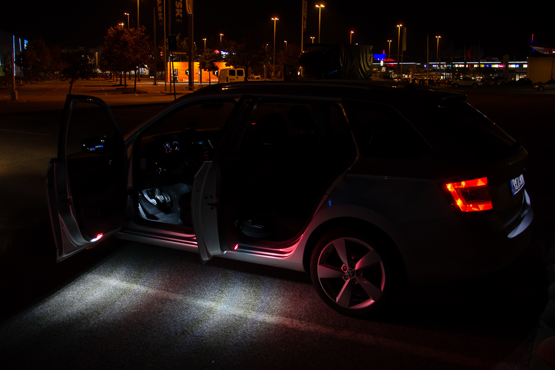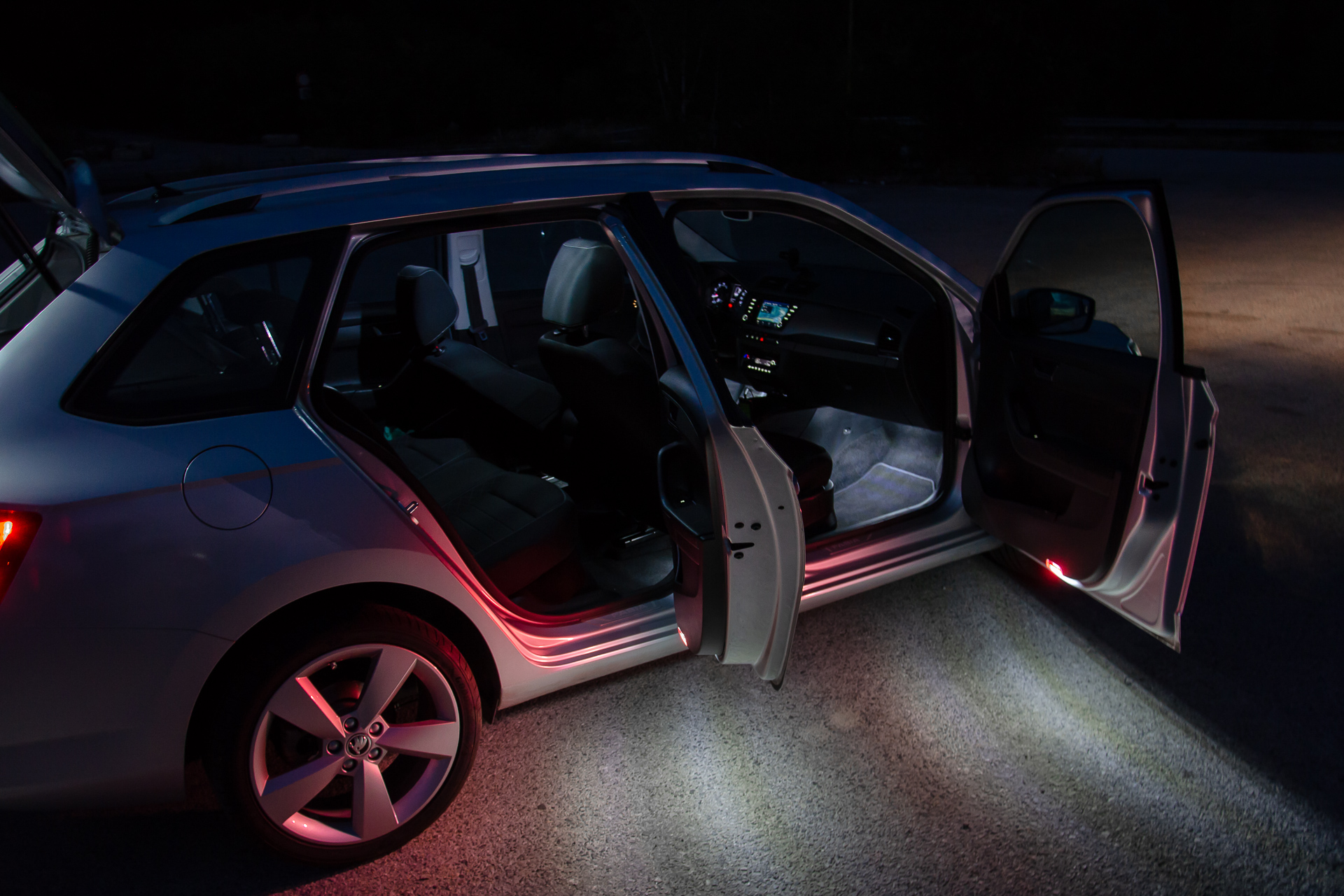 Moja pôvodná predstava bola, aby to svietilo iba spolu so stropnými svetlami so zníženou intenzitou, až keď sa otvoria dvere, aby intenzita šla na 100%. Po opätovnom zavretí dverí sa intenzita opäť zníži. Úplne vypnúť by sa mali, až keď sa vypnú stropné svetlá. Pravdepodobne moja predstava nepôjde nakódovať a preto som spokojný aj so súčasným stavom, keď to svieti iba so stropnými svetlami a iba na 100%. Počas jazdy to momentálne nechcem mať rozsvietené ani na 10%, ale či sa mi to časom nezapáči, to nevylučujem. Je tam však nejaký problém s kódovaním, aby to svietilo so zapnutým zapaľovaním so zníženou intenzitou, ako to má aj wirer vo svojom aute. Pravdepodobne je tam nejaký problém s kódovaním kvôli štartovaciemu tlačidlu, wirer to ešte preveruje.