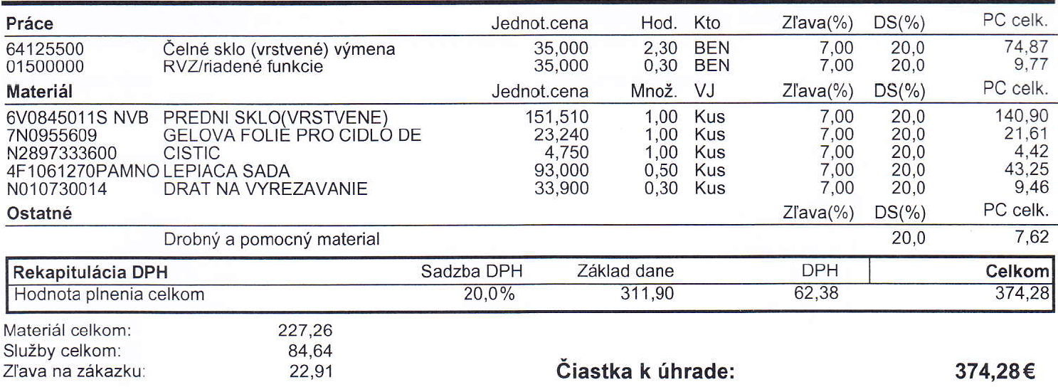 Keďže už som vedel celý postup vybavovania opravy cez poisťovňu, celá oprava prebehla veľmi rýchlo. Presne týždeň od udalosti som mal opravené auto doma. Celková škoda predstavovala 374 EUR, ja som platil iba „symbolickú“ spoluúčasť.