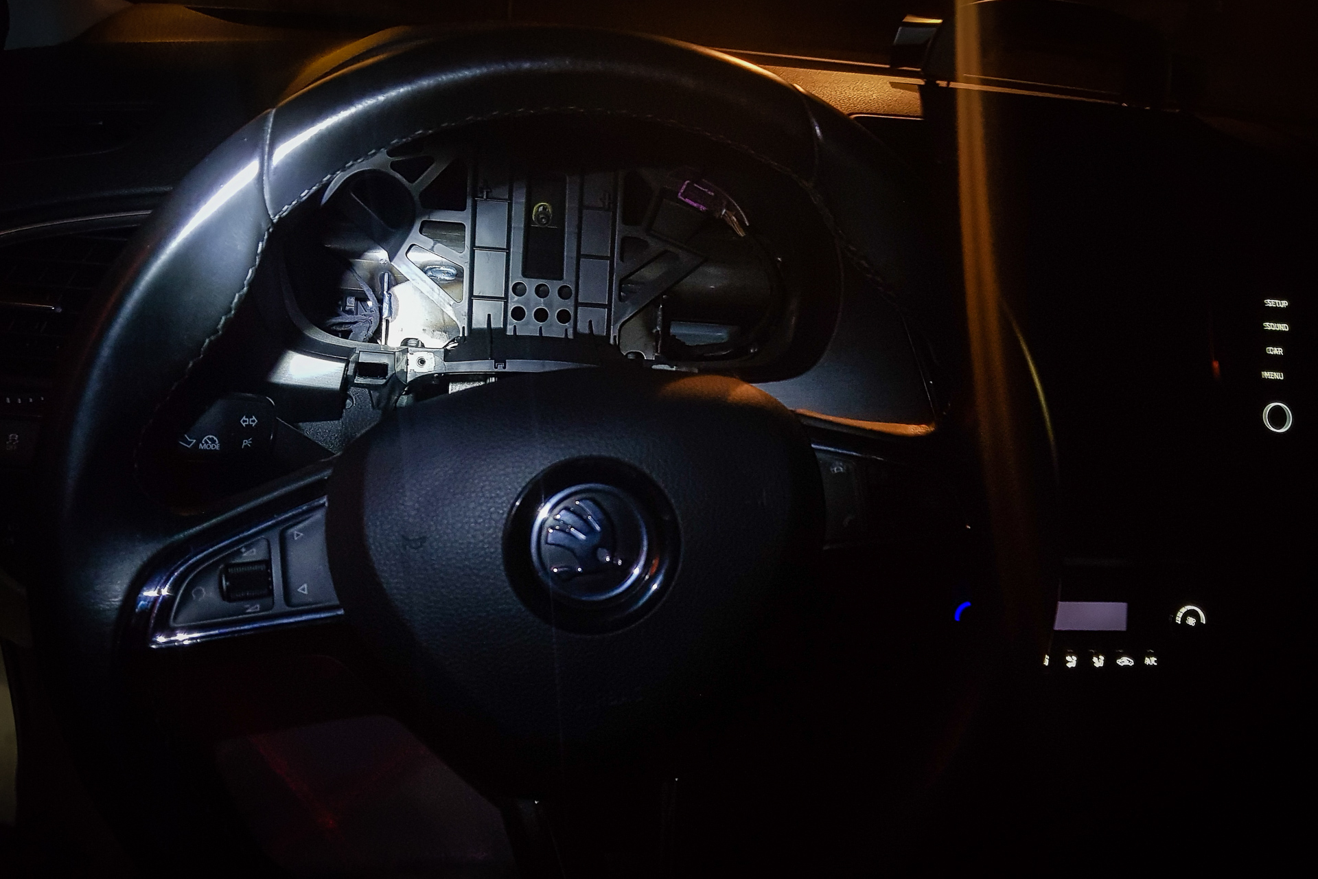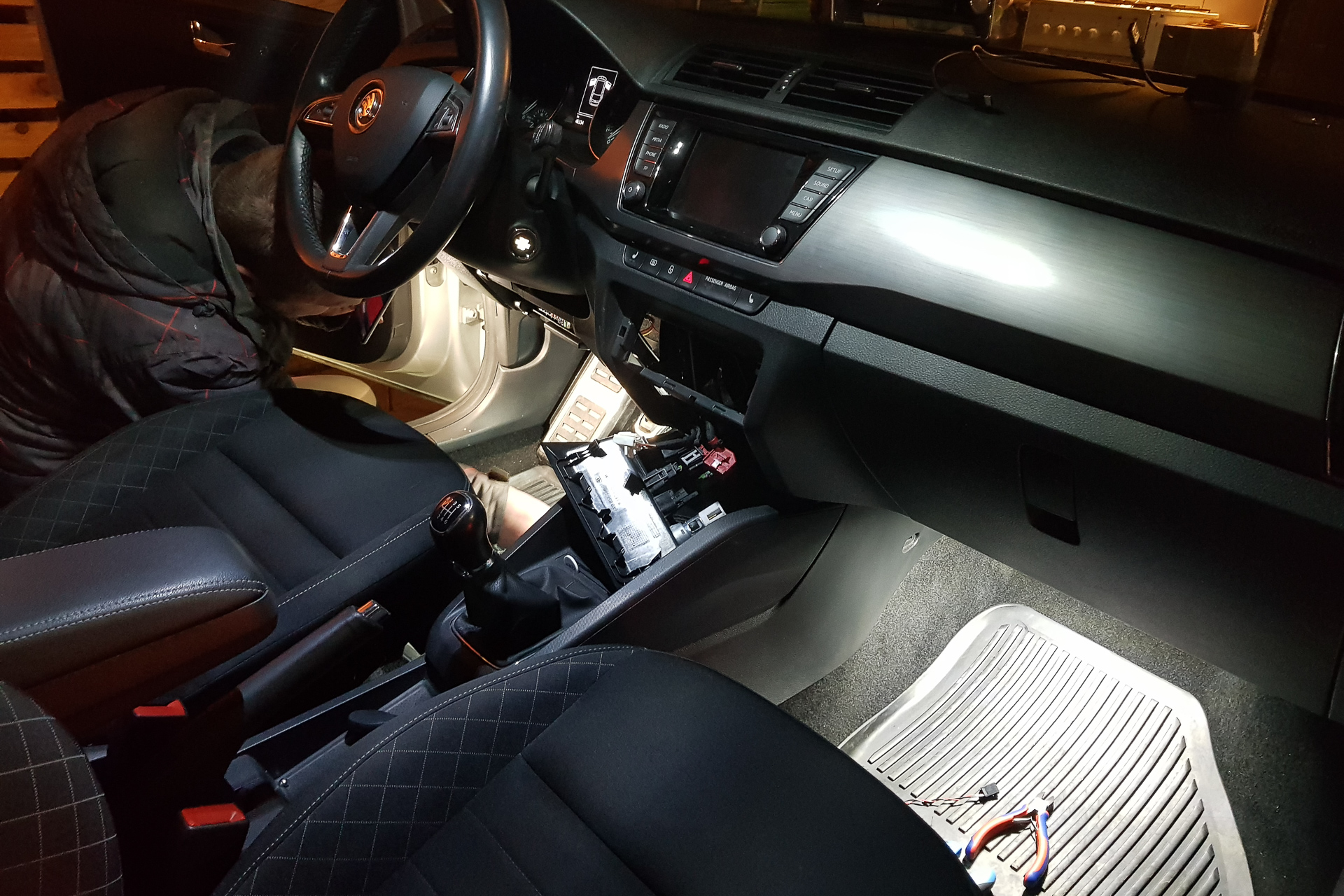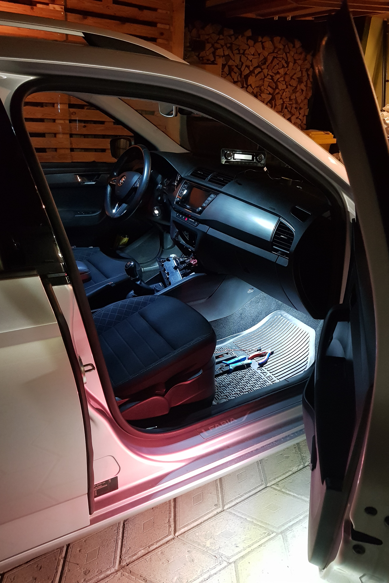Ako prvé sa dorobilo osvetlenie stredovej odkladacej schránky pod klimatizáciou. Rýchlo som si na toto svetielko zvykol na požičanej FL Fabke a v mojej Fabči mi to zrazu začalo chýbať. Preto som ho chcel čím skôr nechať dorobiť. Konkrétne sa jedná o svetielko č. 7P6 919 390 A KT1, viac info vo wirerovom návode. S výsledkom spokojnosť, je to príjemné decentné osvetlenie hlavne pri nastupovaní a vystupovaní.