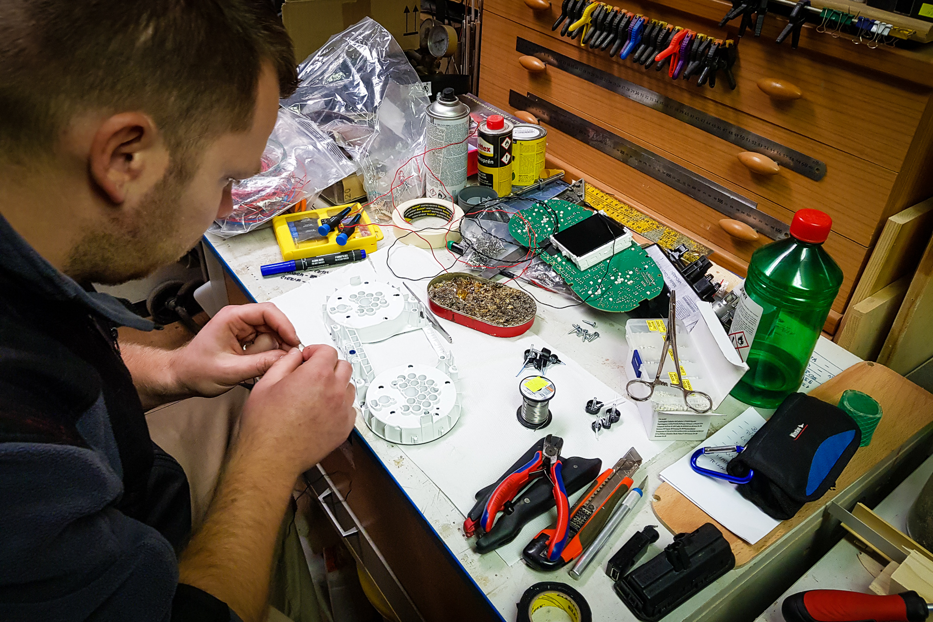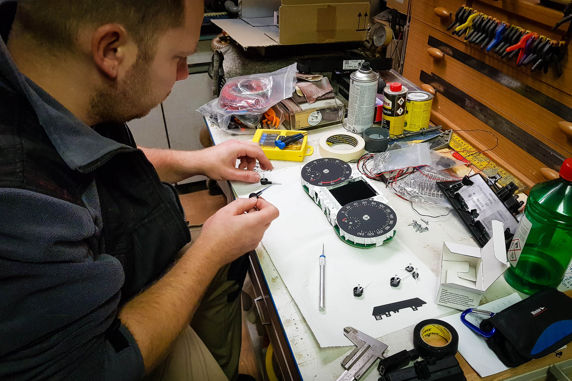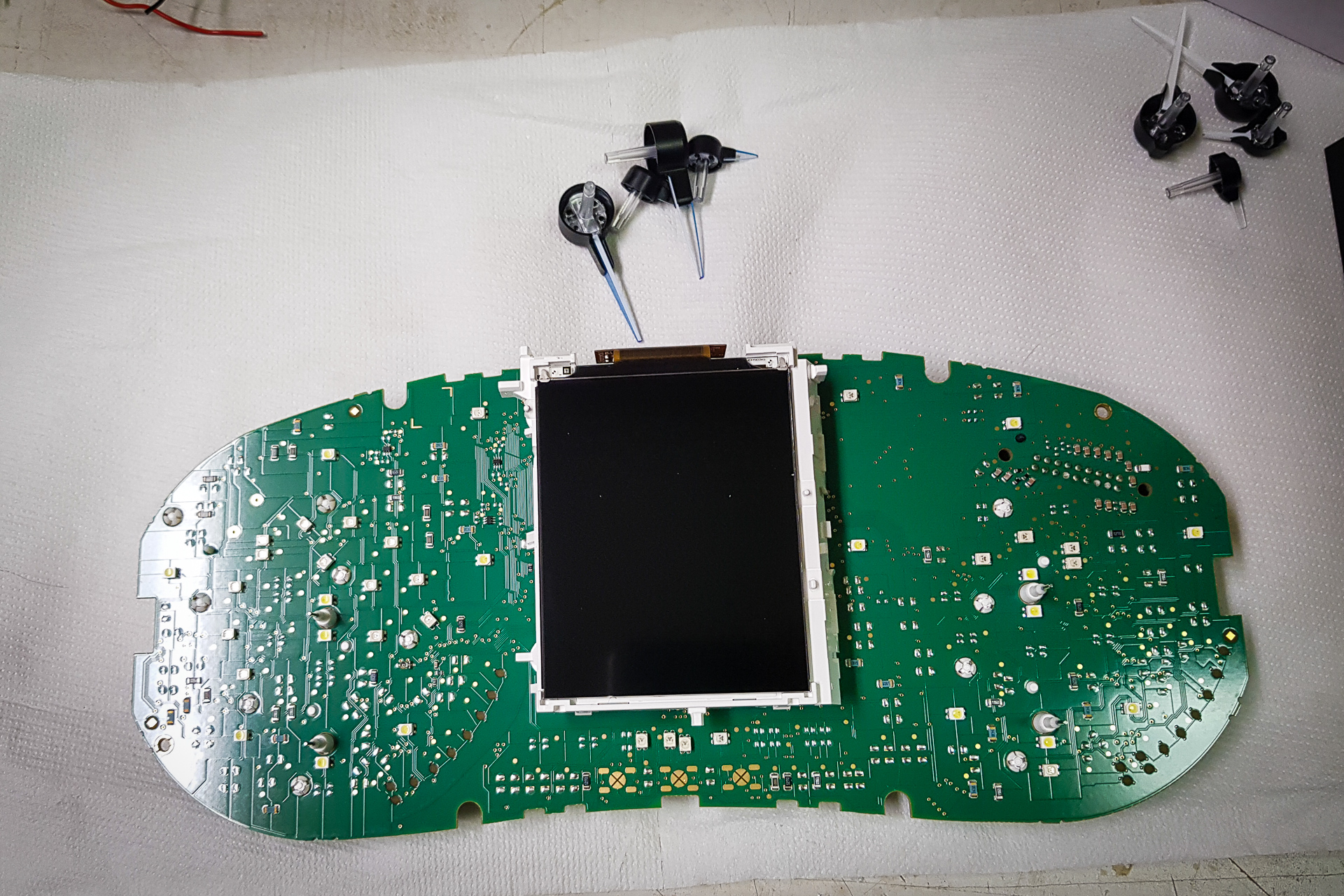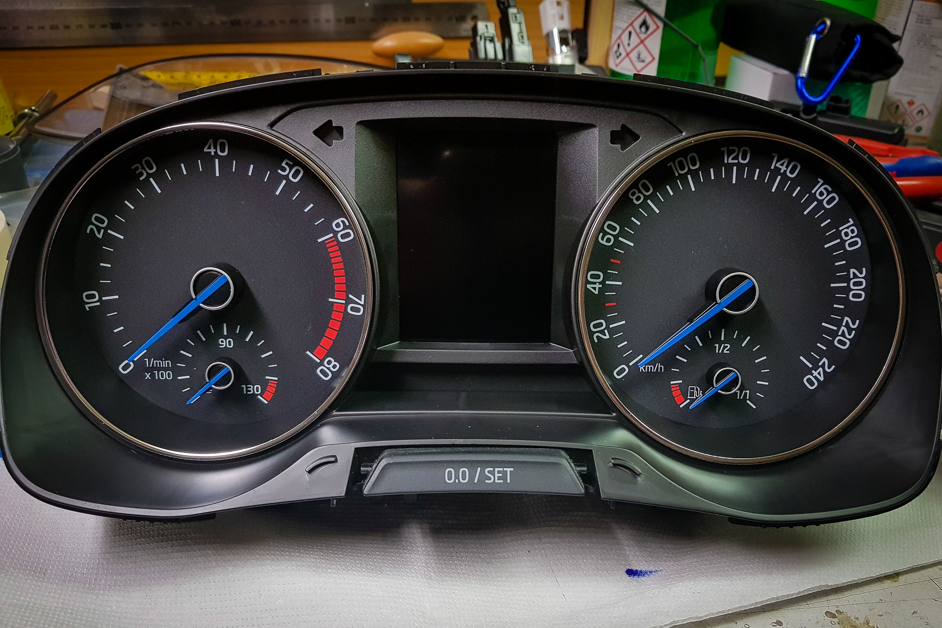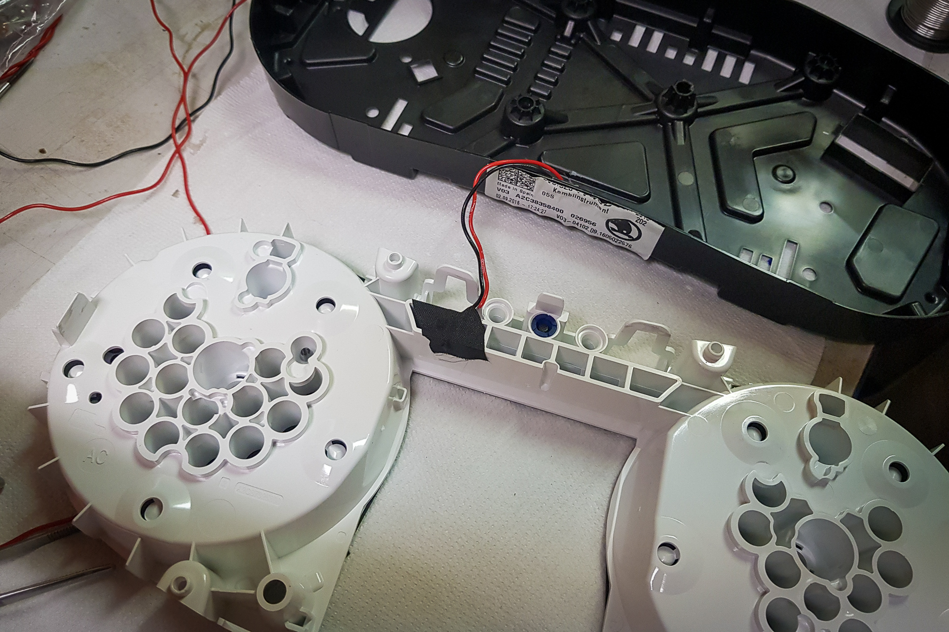 Pokračovanie bolo už o niečo zaujímavejšie… šli sa rozoberať budíky. Ani sa mi nechcelo veriť, že toto bola ich prvá rozoberačka. Hlavným dovôdom boli 4 nové ručičky, ktoré na mňa čakali už hádam od leta, kedy wirerovi podarilo zohnať červenú a modrú sadu. On si vzal červenú a ja som si hneď zarezervoval modrú. Mala by to byť verzia z Golfíka R – mohlo by to byť príjemné osvieženie budíkov. Dlhšie ručičky sa museli trochu skrátiť, podsvietenie pod ručičkami zostalo originálne biele. A popritom všetkom som si objednal aj kontrolku stretávačiek. Trochu bola dilema, akú farbu použiť, ale nakoniec vyhrala tá decentnejšia verzia! Bližšie info o kontrolke v návode u wirera.