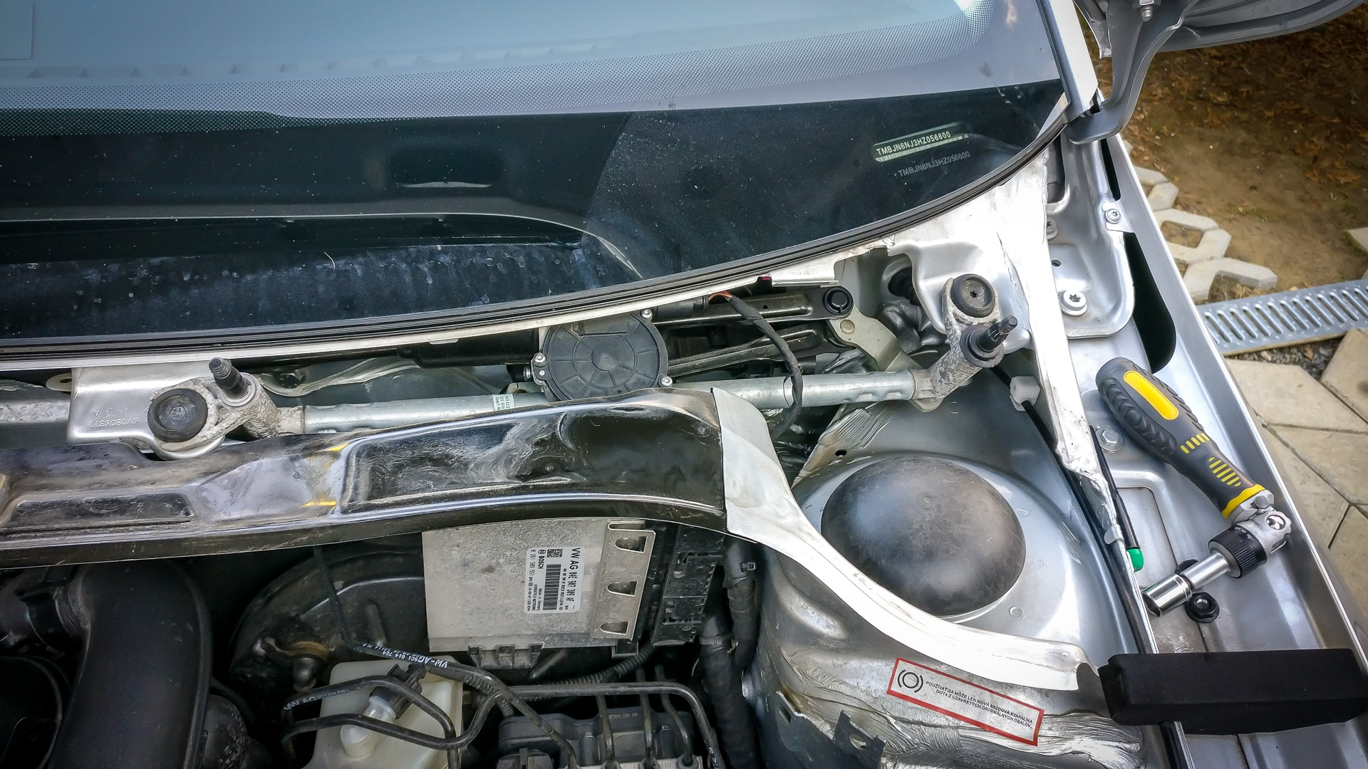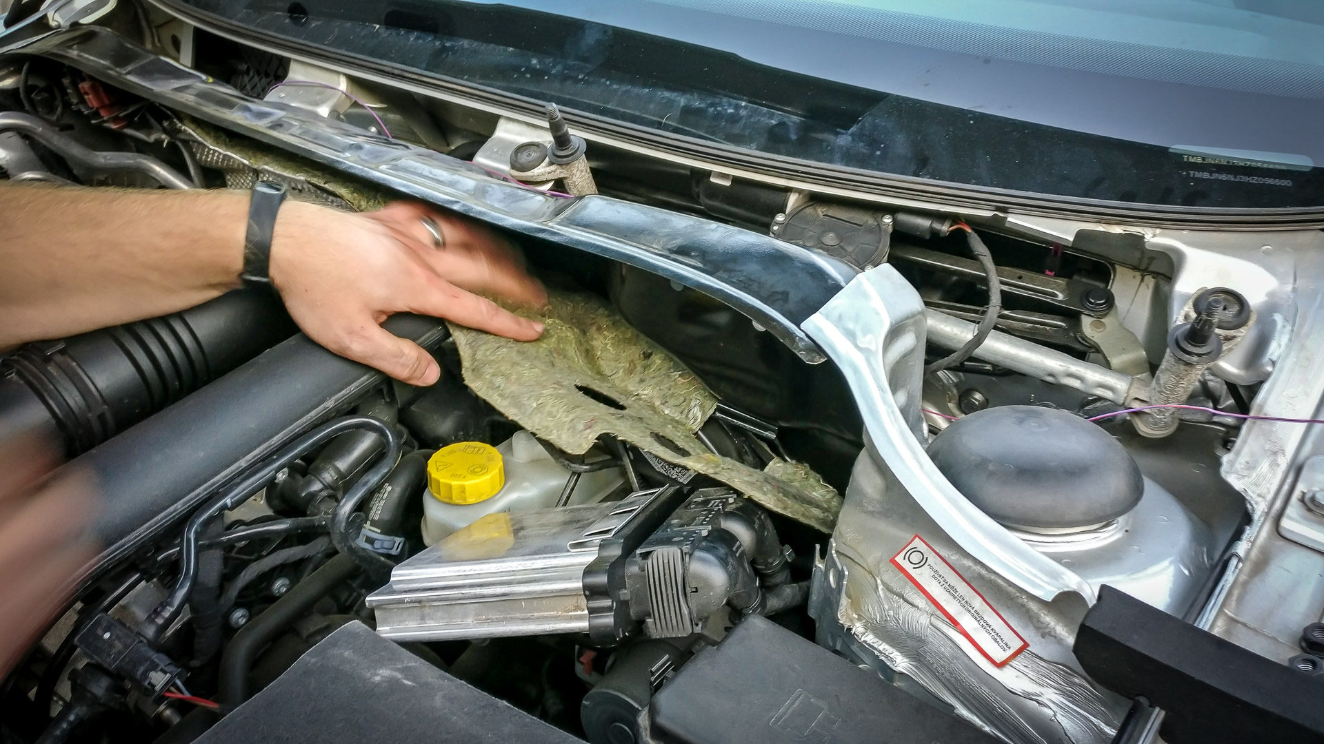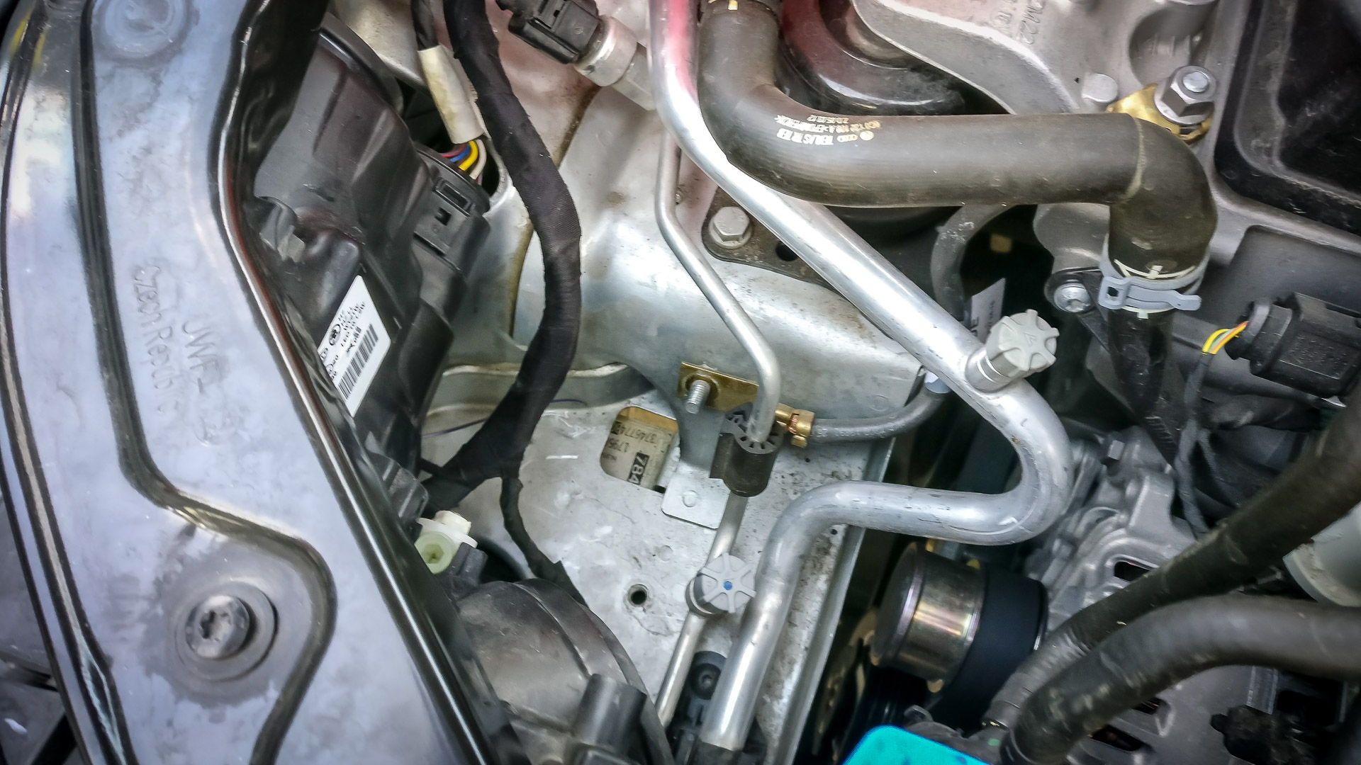 Nasledovalo rozoberanie časti auta pod kapotou, aby sa mohol natiahnuť kábel zo senzora do riadiacej jednotky. Konkrétne šli von stierače a všetky plasty pod nim, riadiacia jednotka motora.. a ešte pár skrutiek uvoľnil, napr. vybral celú nádržku chladiacej kvapaliny. Ale aspoň som popritom odfotil hrdlo sania, ktoré som v júni pri montáži nestihol odfotiť. Inak, klapka bola zavretá, keďže mám Climatronic.
