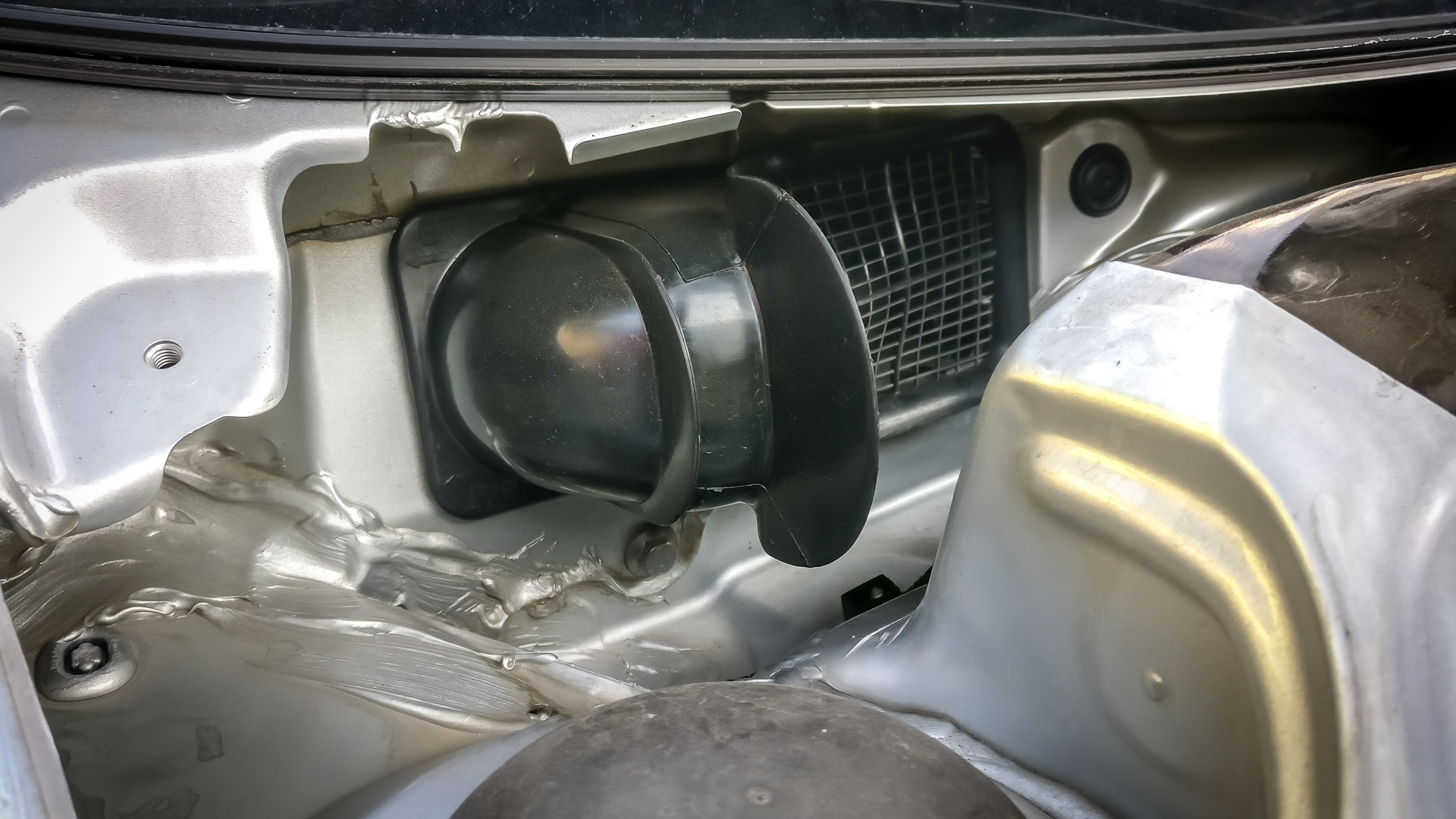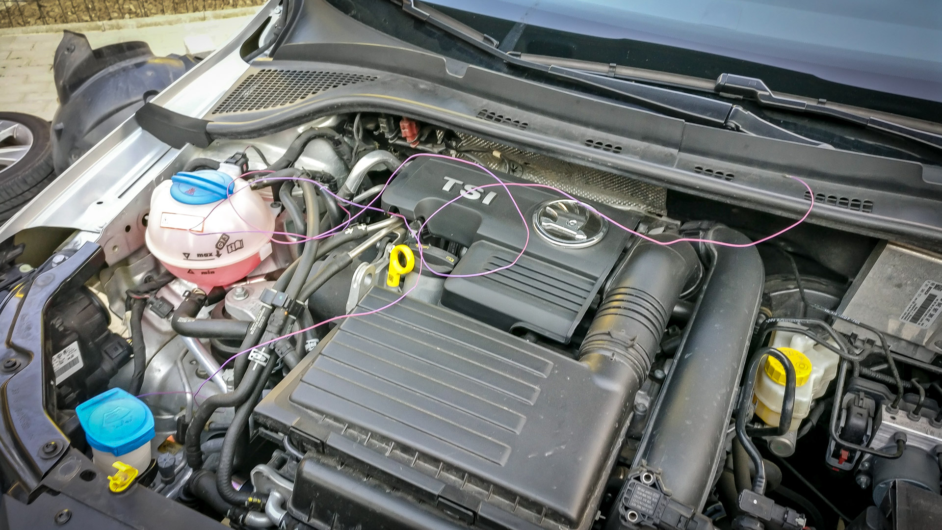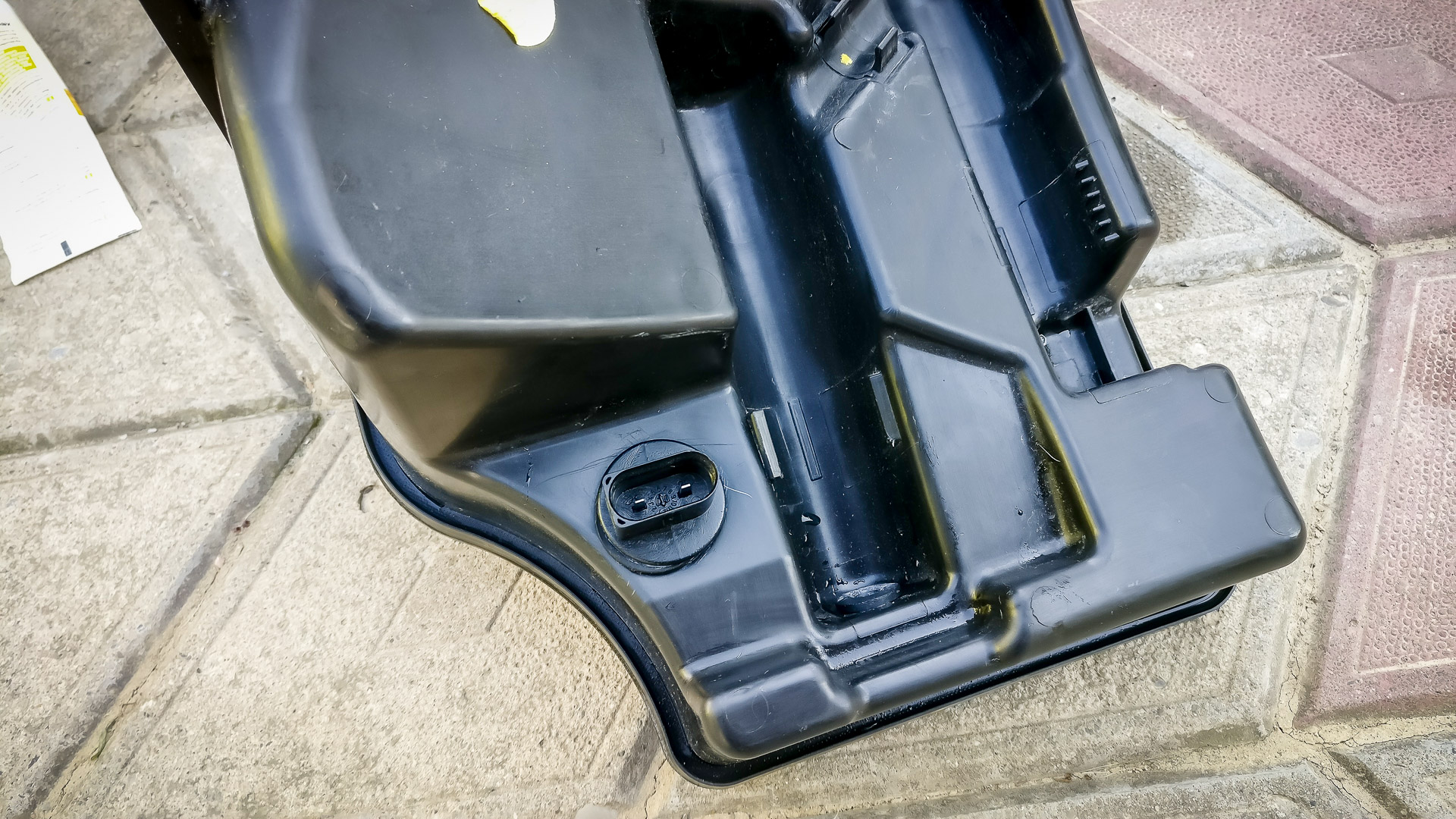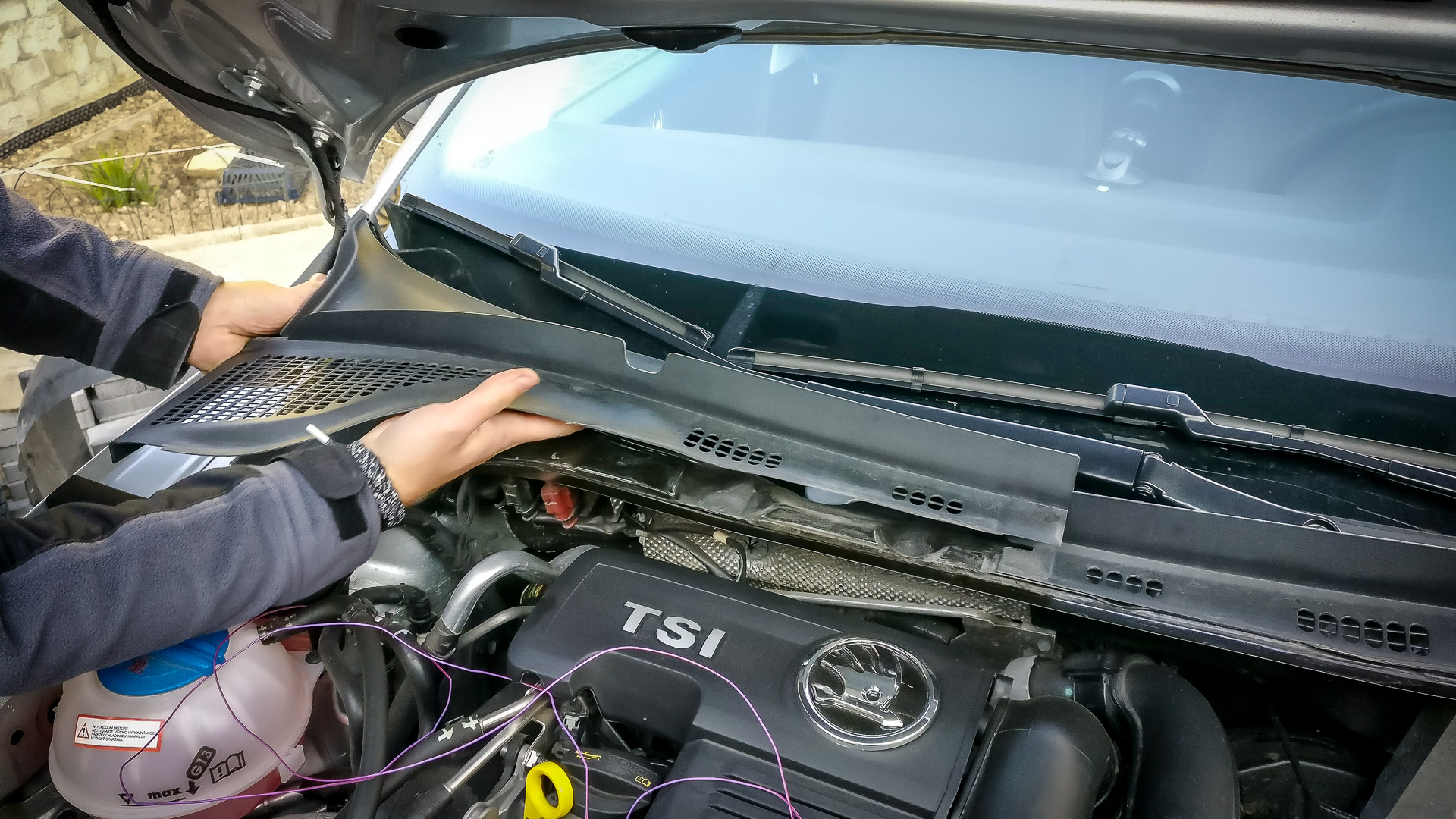 Nasledovalo rozoberanie časti auta pod kapotou, aby sa mohol natiahnuť kábel zo senzora do riadiacej jednotky. Konkrétne šli von stierače a všetky plasty pod nim, riadiacia jednotka motora.. a ešte pár skrutiek uvoľnil, napr. vybral celú nádržku chladiacej kvapaliny. Ale aspoň som popritom odfotil hrdlo sania, ktoré som v júni pri montáži nestihol odfotiť. Inak, klapka bola zavretá, keďže mám Climatronic.