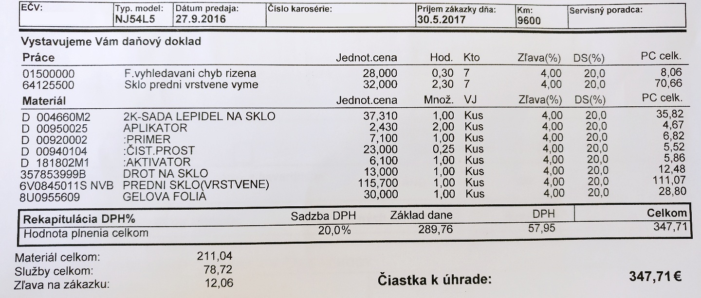 Po behačkách po poisťovniach som nakoniec bol odniesť auto do autorizovaného servisu na výmenu skla. Prvý odhad ceny opravy bol 700€, pri obhliadke na základe ceny čelného skla upravená cena do 500€, pri odovzdávaní auta do opravy odhad na základe kalkulácie poisťovne na nejakých 350€, finálna faktúra 347,71€. Snáď urobili všetko ako mali. Sumu som uhradil a čakám na vyjadrenie poisťovne. Vinník vraj škodu hlásil včera večer osobne na pobočke, ale dnes v systéme Kooperatívy ešte nič nebolo. Uvidíme…