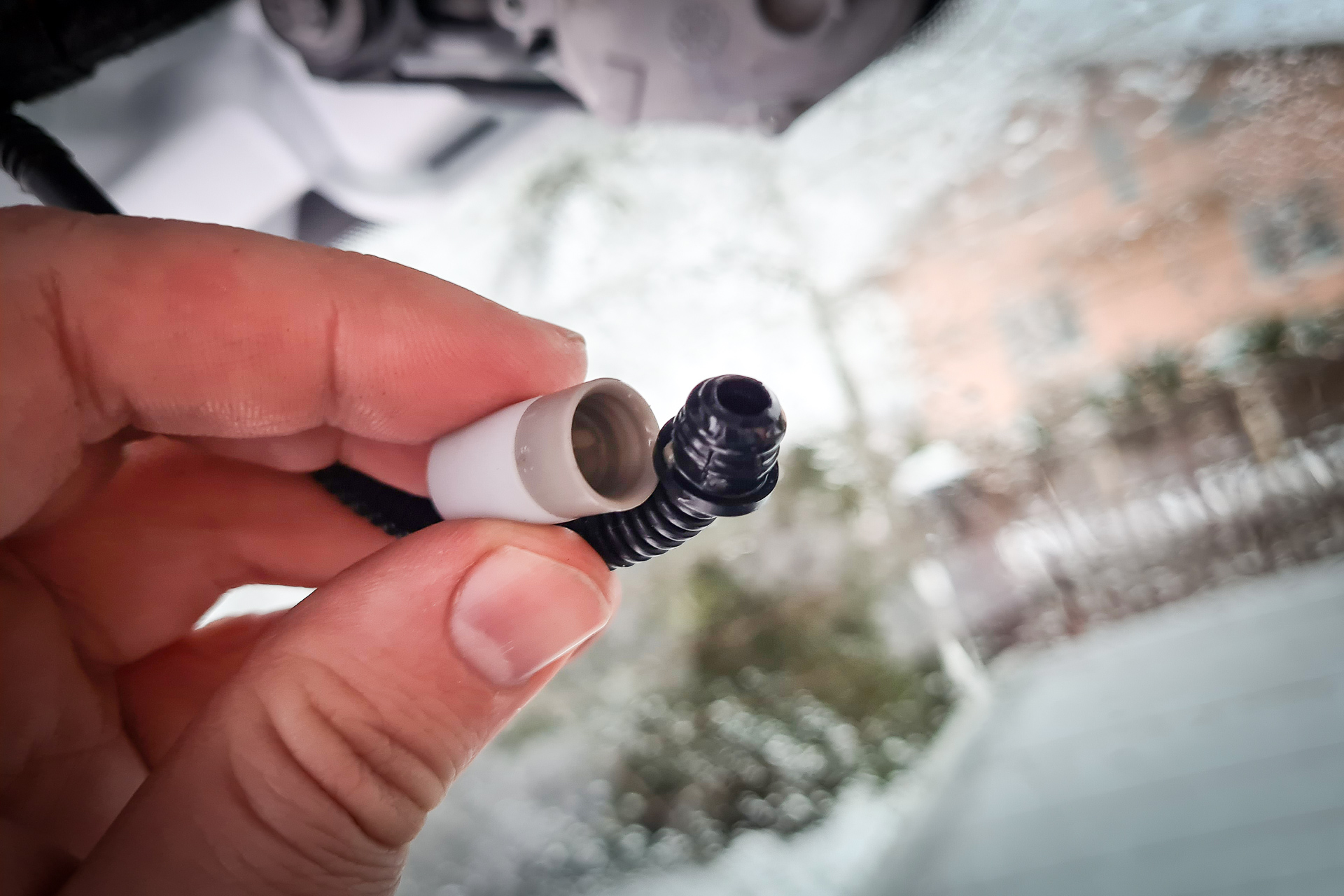 Mal som podozrenie, že príčinou vody vo svetielku je poškodené tesnenie okolo zadného stierača, ktorý mi menili v septembri v rámci záruky. Odvtedy sa mi v náhodných intervaloch objavoval po otvorení kufra stekanec vody z vnútornej strany zadného skla. Pri detailnejšom skúmaní som sa náhodou dotkol hadičky vedúcej do parkovacej kamery a tá mi zrazu zostala v ruke. Buď ju vytrhli pri výmene stierača alebo spojku roztiahla zamrznutá voda. Pravdepodobne si spravíme výlet do Prešova.
