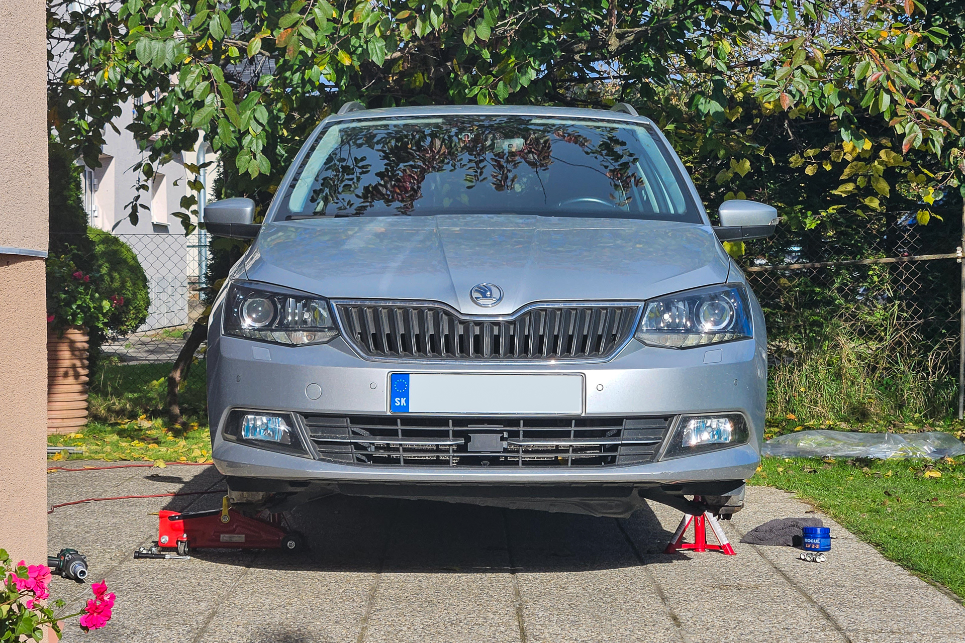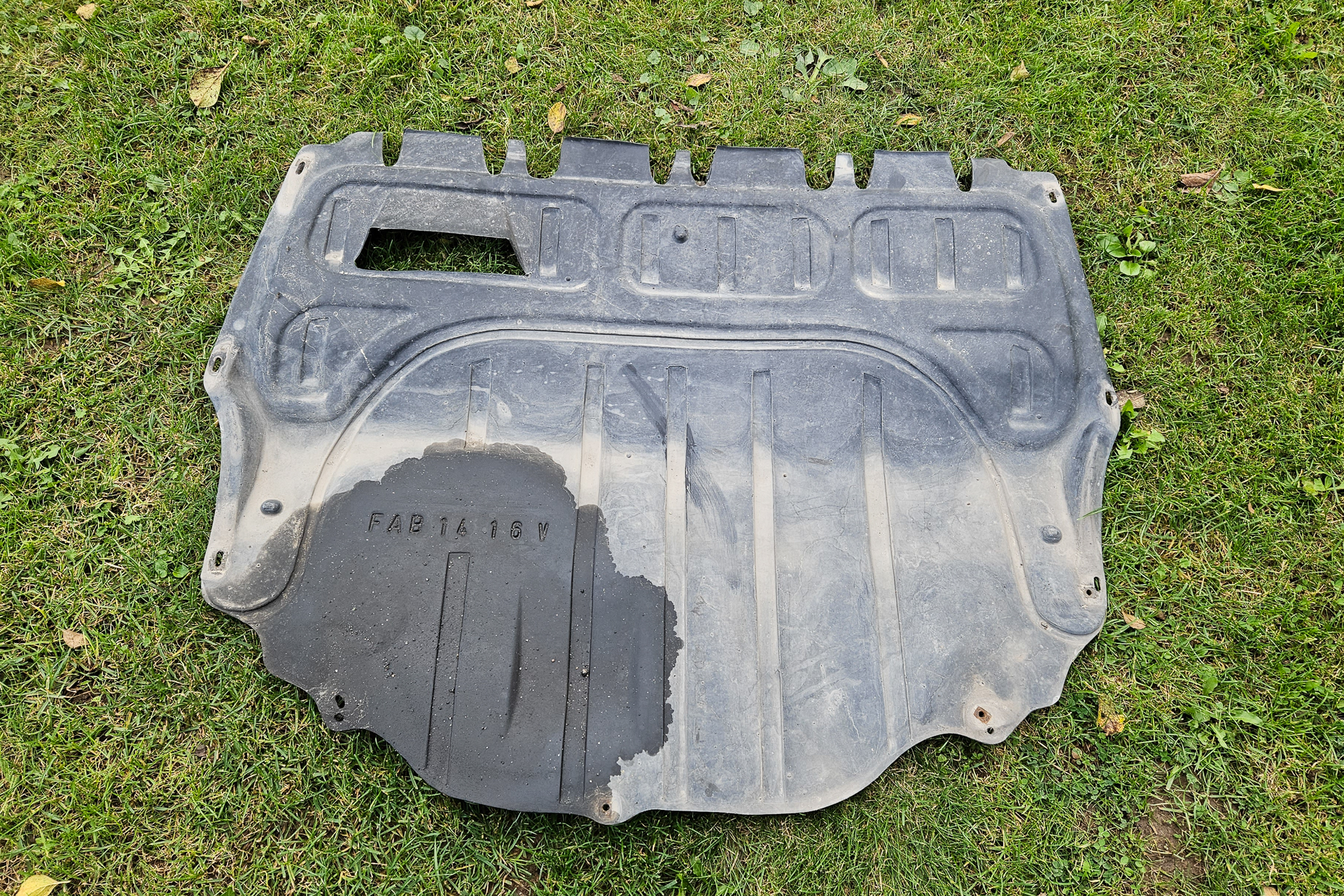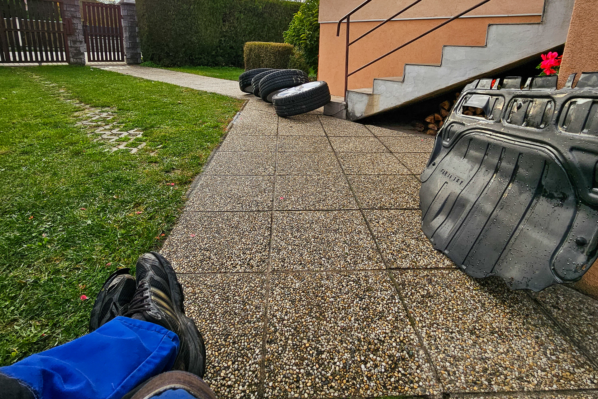 Taktiež sme z pivnice vydolovali starý krátky spodný kryt motora a využili sme vytiahnutý zdvihák, aby sme ho dočasne založili miesto celokrytu. Našim zámerom je, aby sa počas jesenných dažďov prečistil spodok motora od vyliatej brzdovej kvapaliny a zároveň sme vyčistili aj veľký kryt (viac tu). Snáď do začiatku zimy sa ich podarí opäť prehodiť.